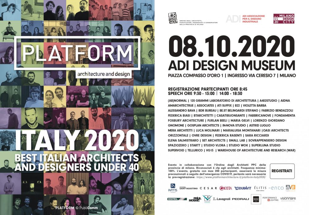 Visto il grandissimo riscontro ottenuto non solo dai diretti interessati ma anche dagli Ordini e da tanti attori del mondo del progetto, è stato deciso di trasformare Platform Italy2020 in un grande happening durante la settimana di Milano ReDesignCity. Tutti i 50 autori, ma anche i saggisti che hanno contribuito al numero, verranno invitati a tenere uno speech in cui raccontare la propria visione in un ritmo molto serrato. A ciascuno verranno dati 8 minuti. L’evento si terrà giovedì 8 ottobre e a fare da cornice a questo momento così intenso e di networking, è stato scelto il Salone Principale di ADI Design Museum che verrà allestito con monitor e sedie e potrà mostrarsi in un evento anche di