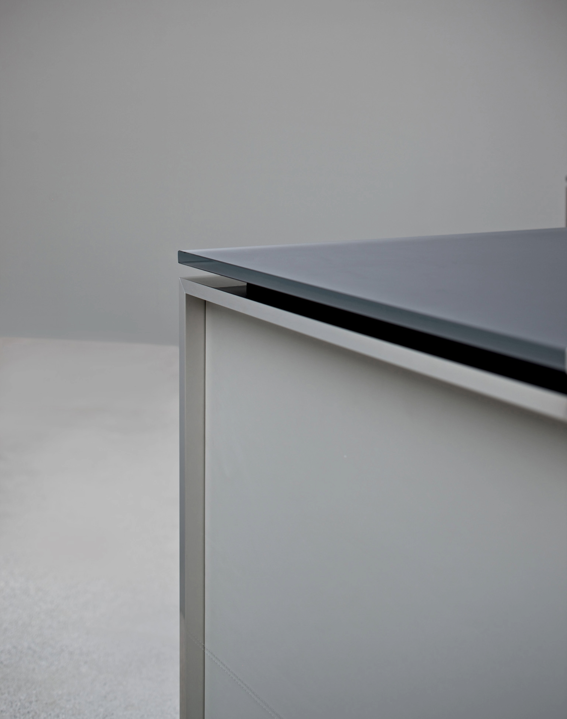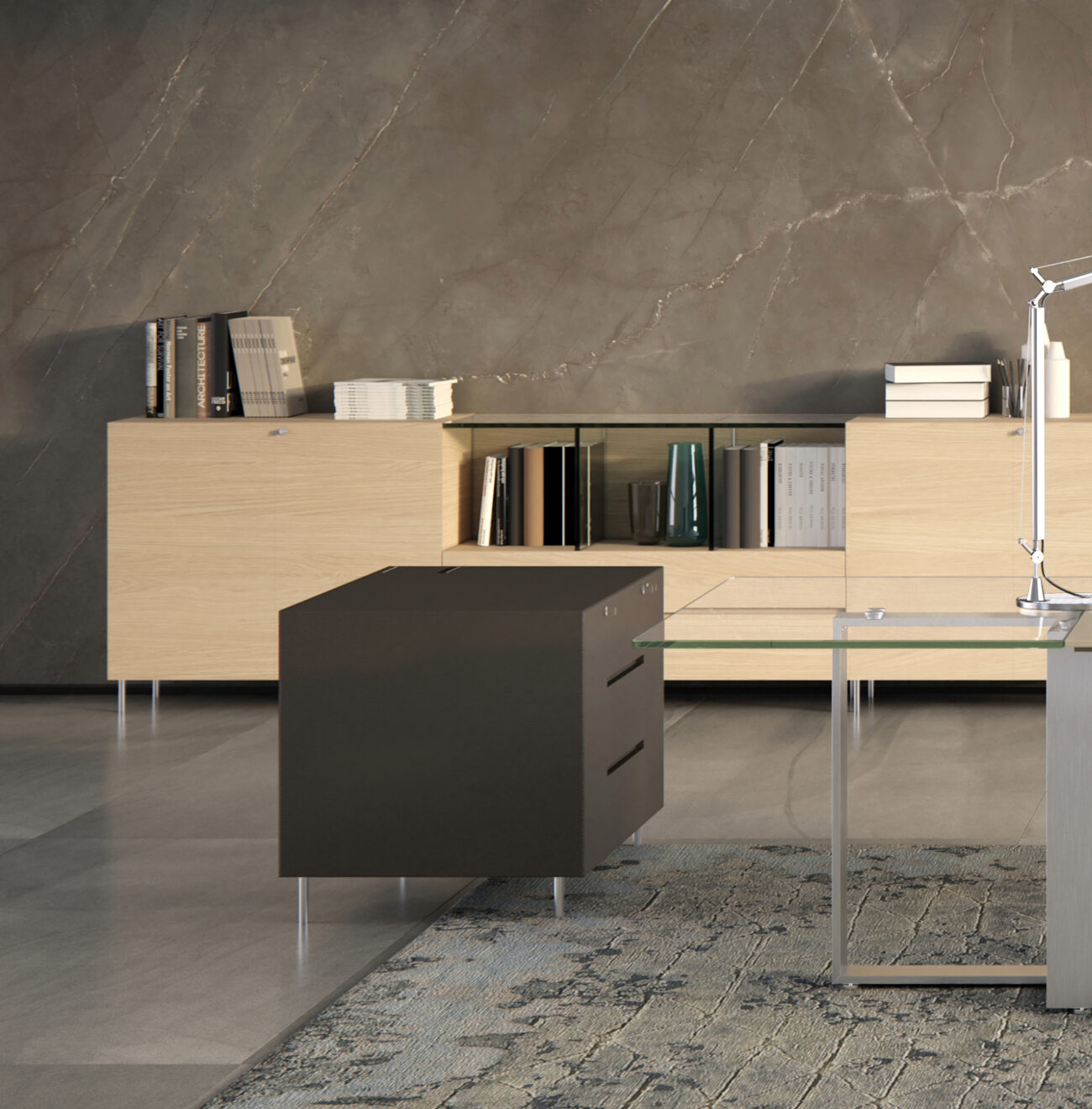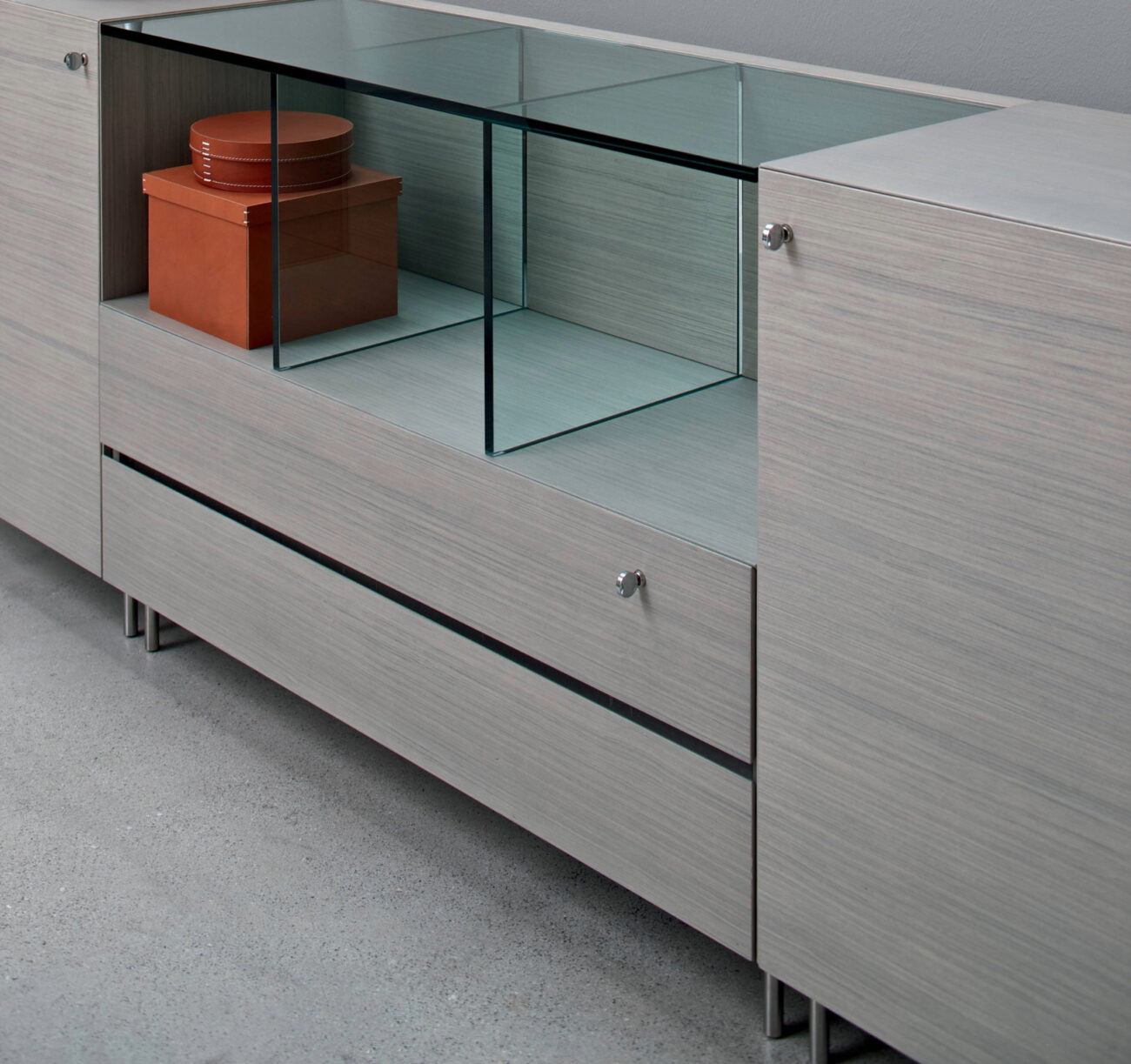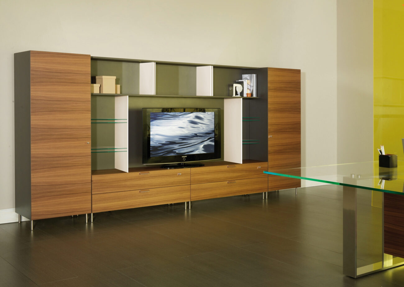 Le forme minimali sono esaltate dall’utilizzo di materiali naturali come la pelle o il legno in un ampio ventaglio di essenze disponibili.
