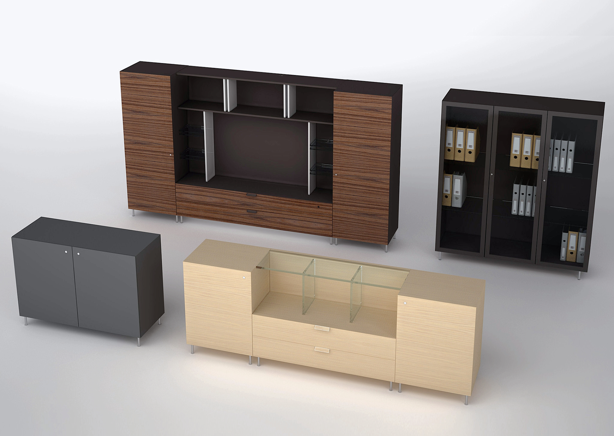 Questa famiglia di contenitori e cassettiere, ante e vano libreria, si completa di elementi boiserie.