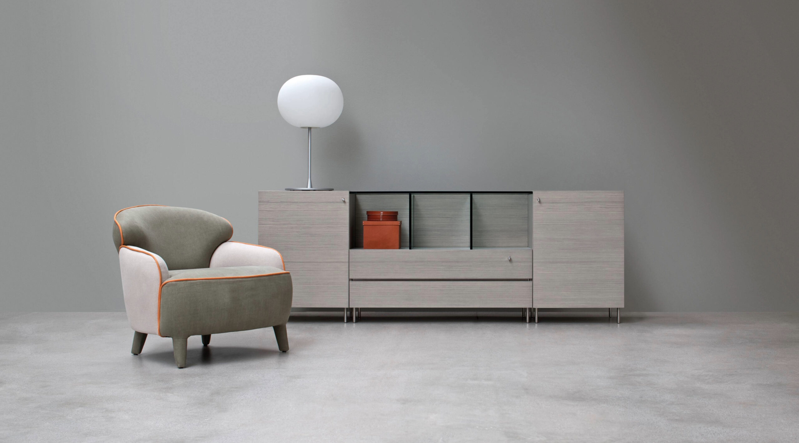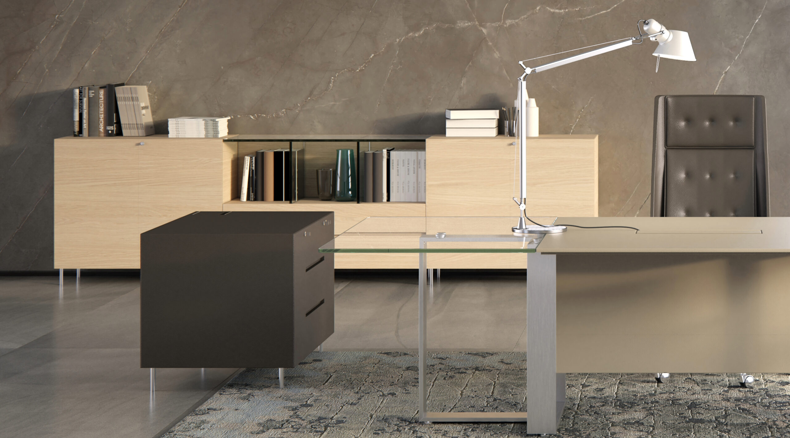 Le forme minimali sono esaltate dall’utilizzo di materiali naturali come la pelle o il legno in un ampio ventaglio di essenze disponibili.