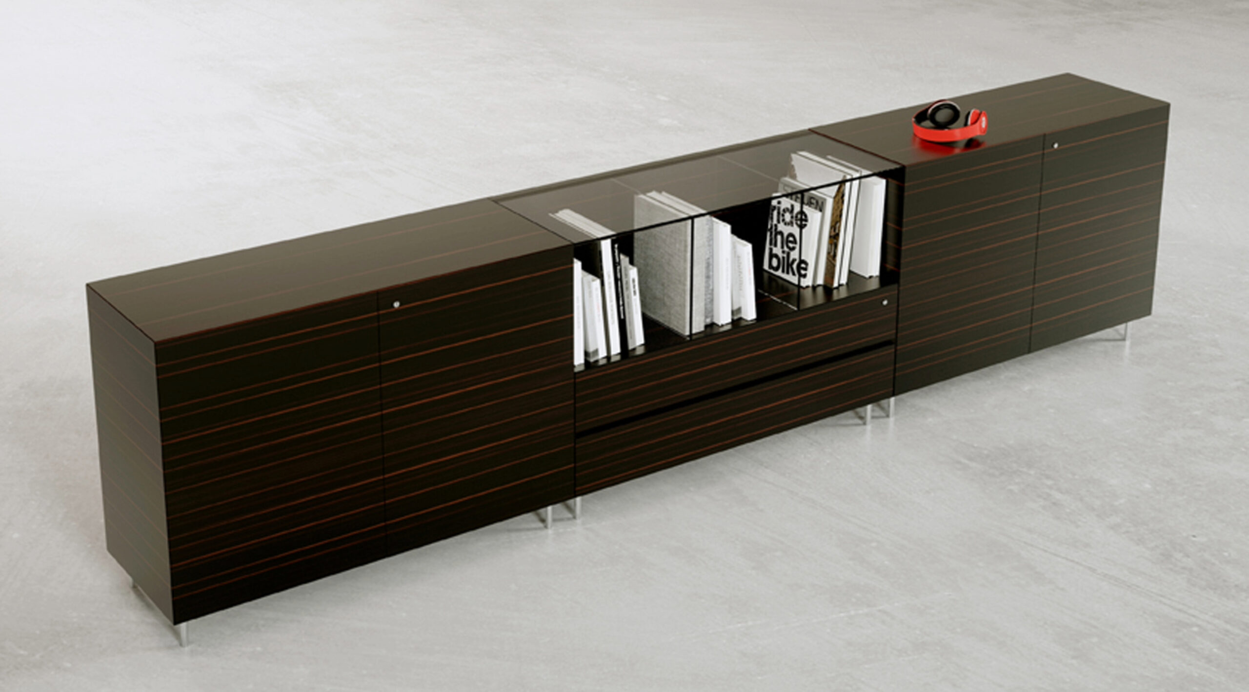 Questa famiglia di contenitori e cassettiere, ante e vano libreria, si completa di elementi boiserie.