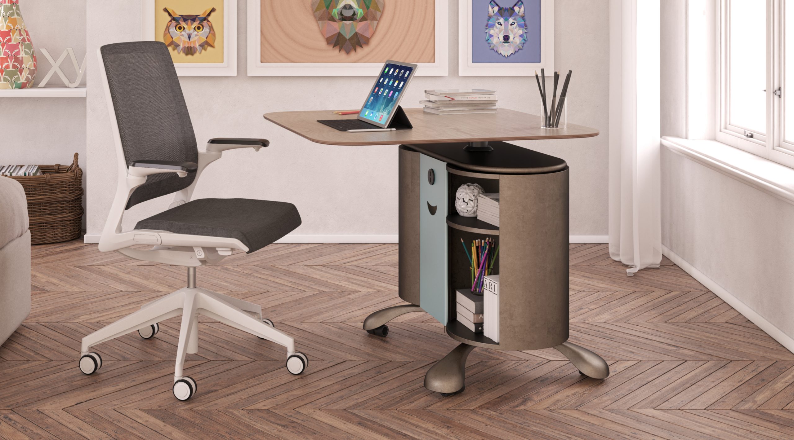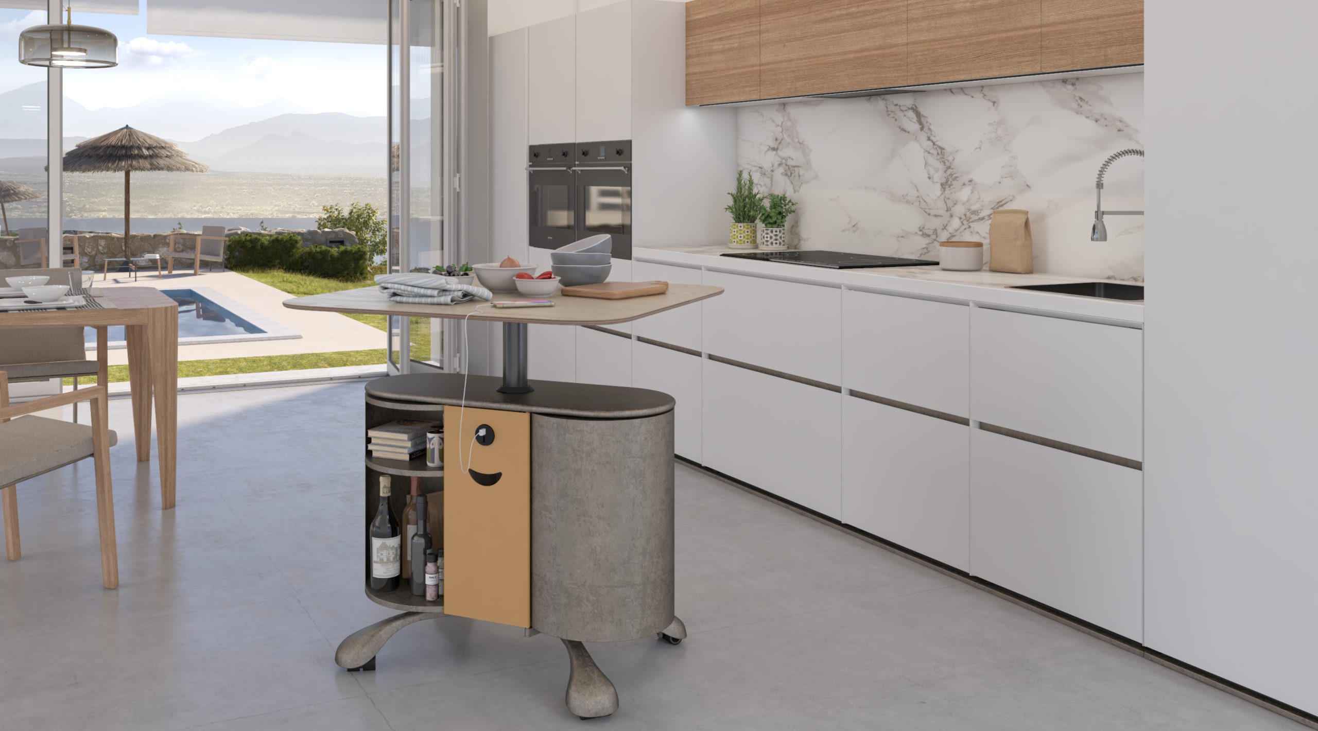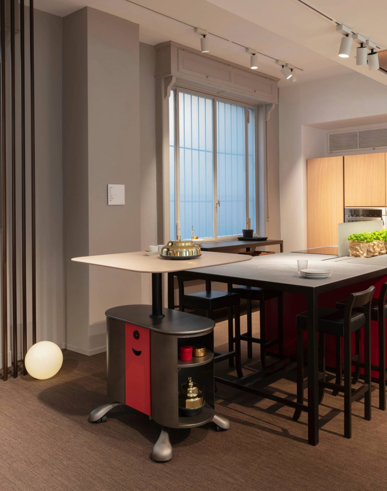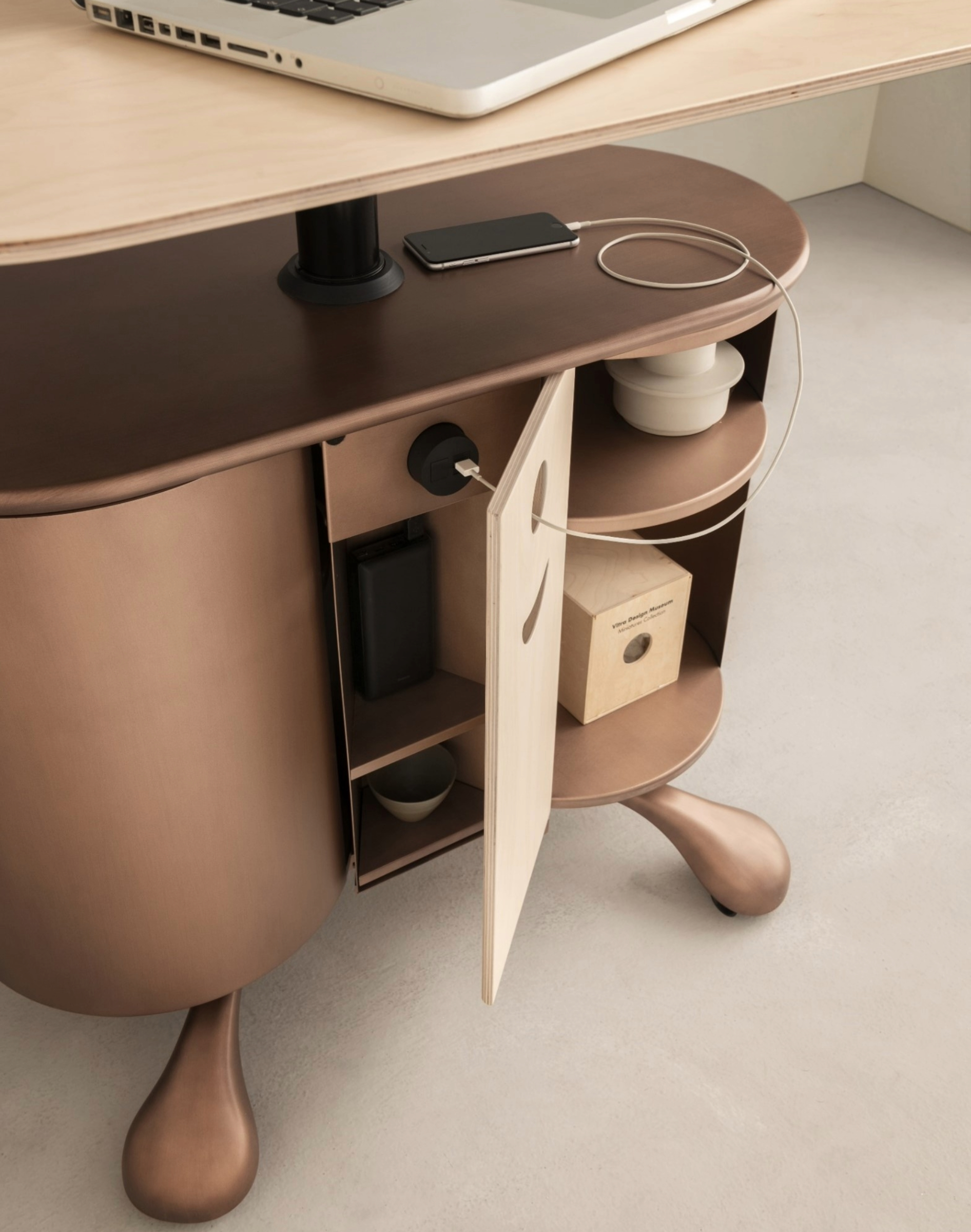 Due vani cilindrici girevoli con funzione contenitore, poggiano su una base con quattro piedi in ABS su ruote.