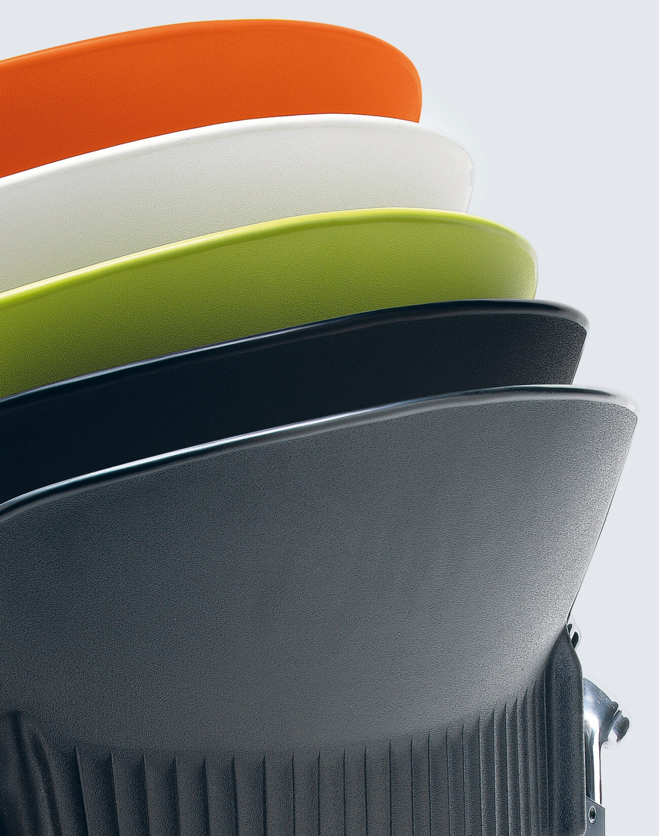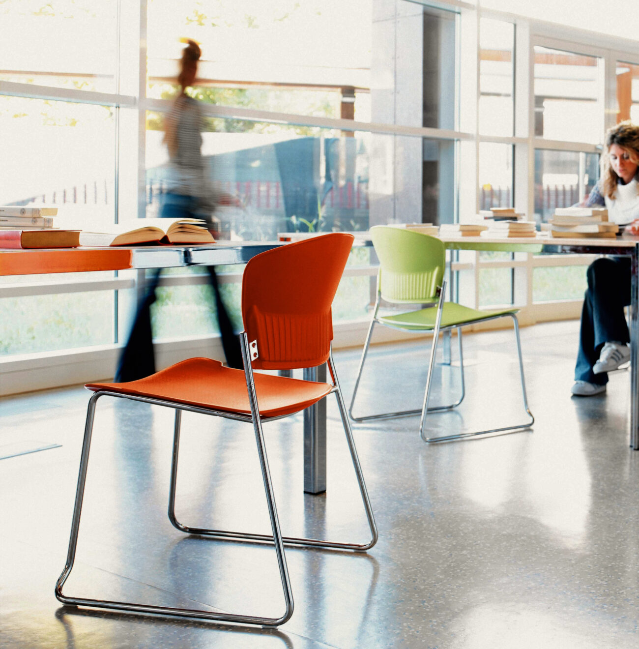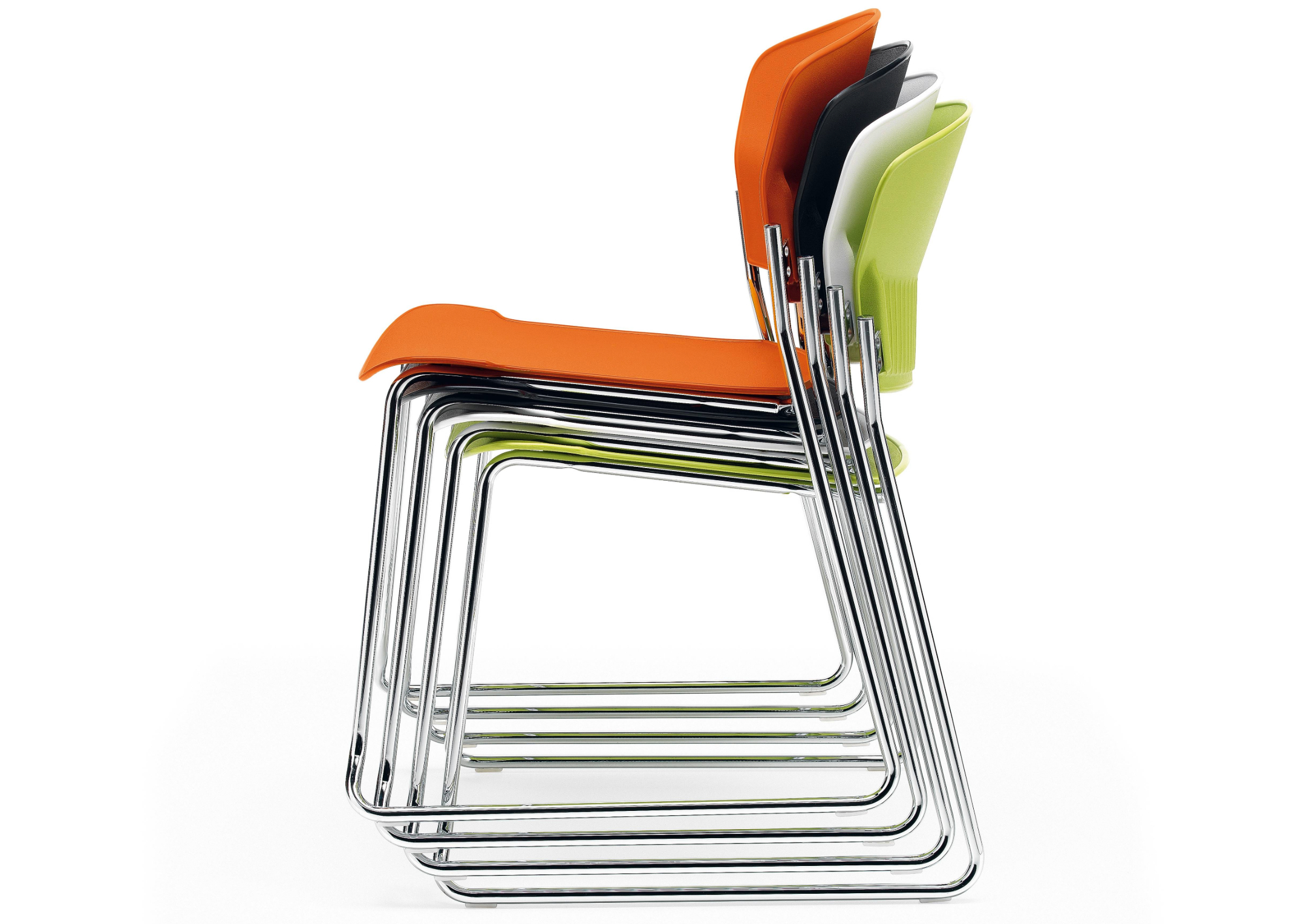 Che la si scelga in versione cantilever, a slitta chiusa o a 4 gambe, questa seduta si può sempre impilare per una migliore razionalizzazione degli spazi.