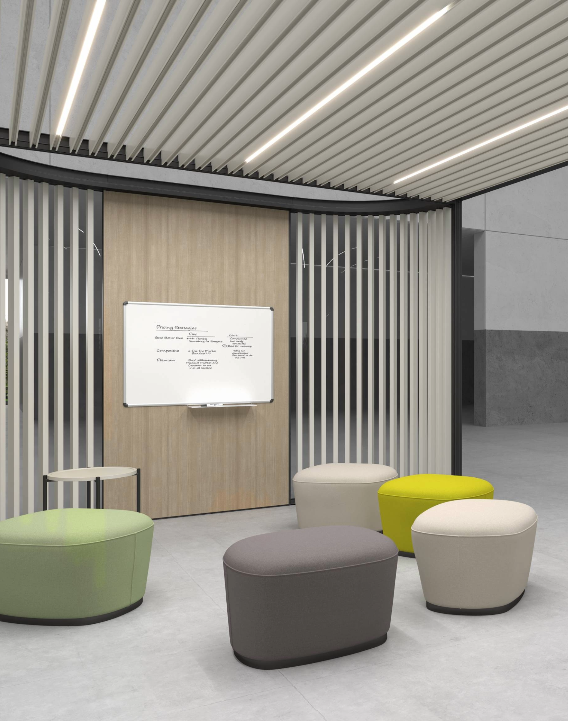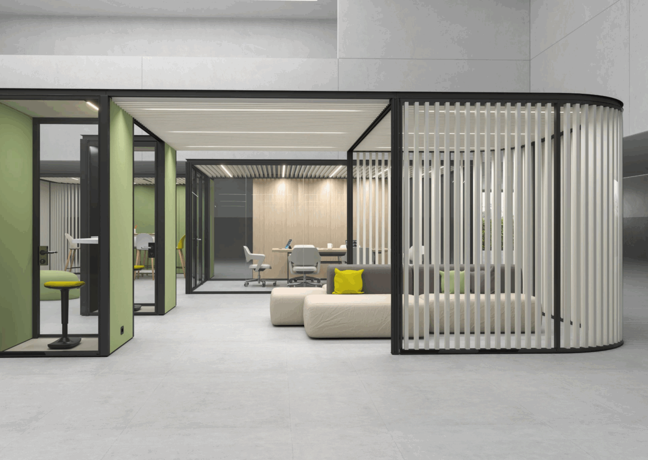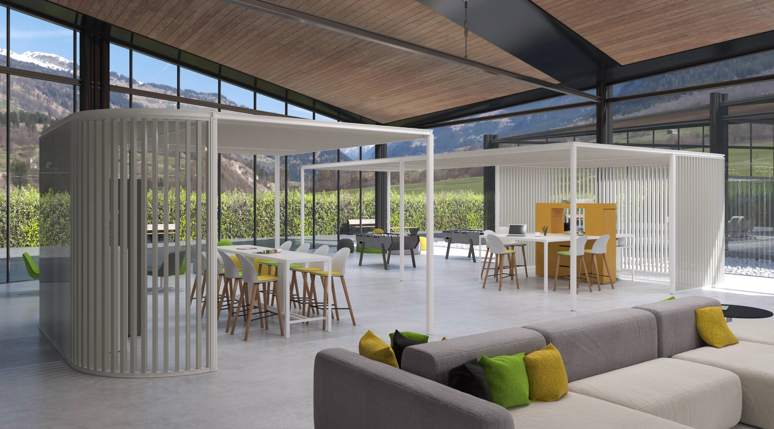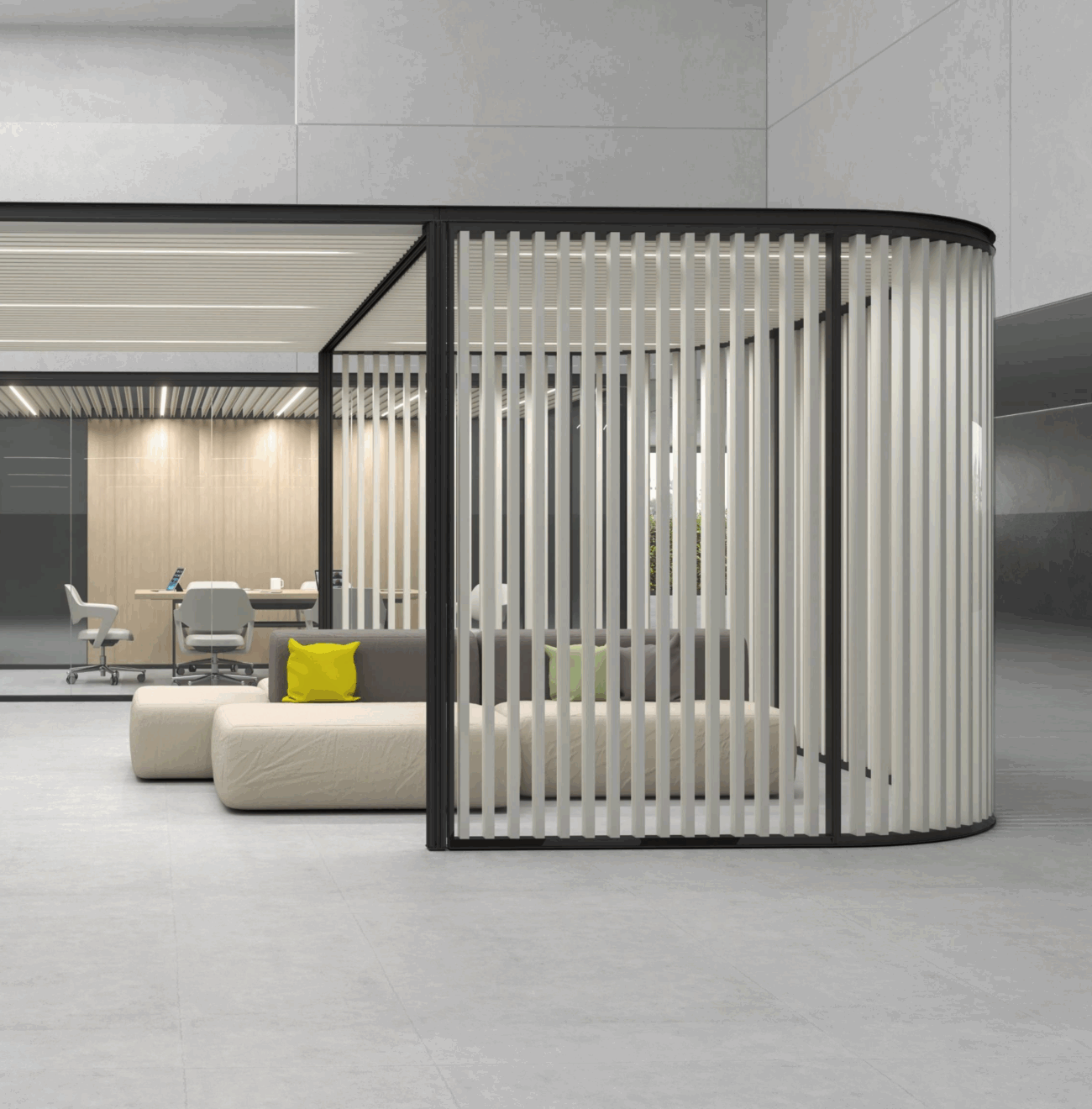 Campiello offre un’interazione flessibile tra gli spazi, grazie alla sua versatilità di utilizzo: i pannelli possono essere montati sia verticalmente, per realizzare pareti, sia orizzontalmente, per creare soffitti con le doghe Terrace. Il risultato è un ambiente dinamico e multifunzionale, capace di evolversi secondo le esigenze lavorative e creative, e che definisce quelle aree ibride formali ed informali sempre più richieste agli space planners.
