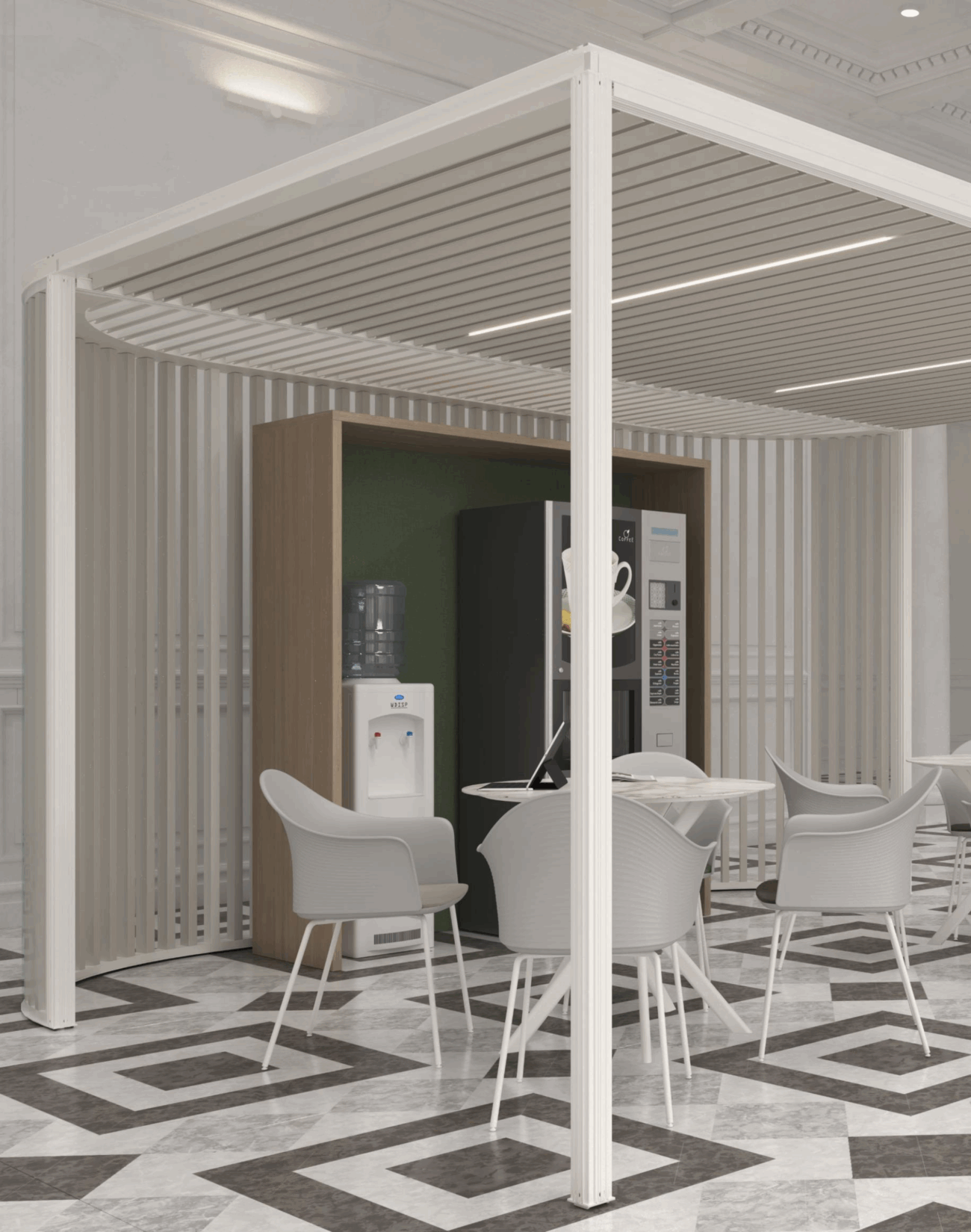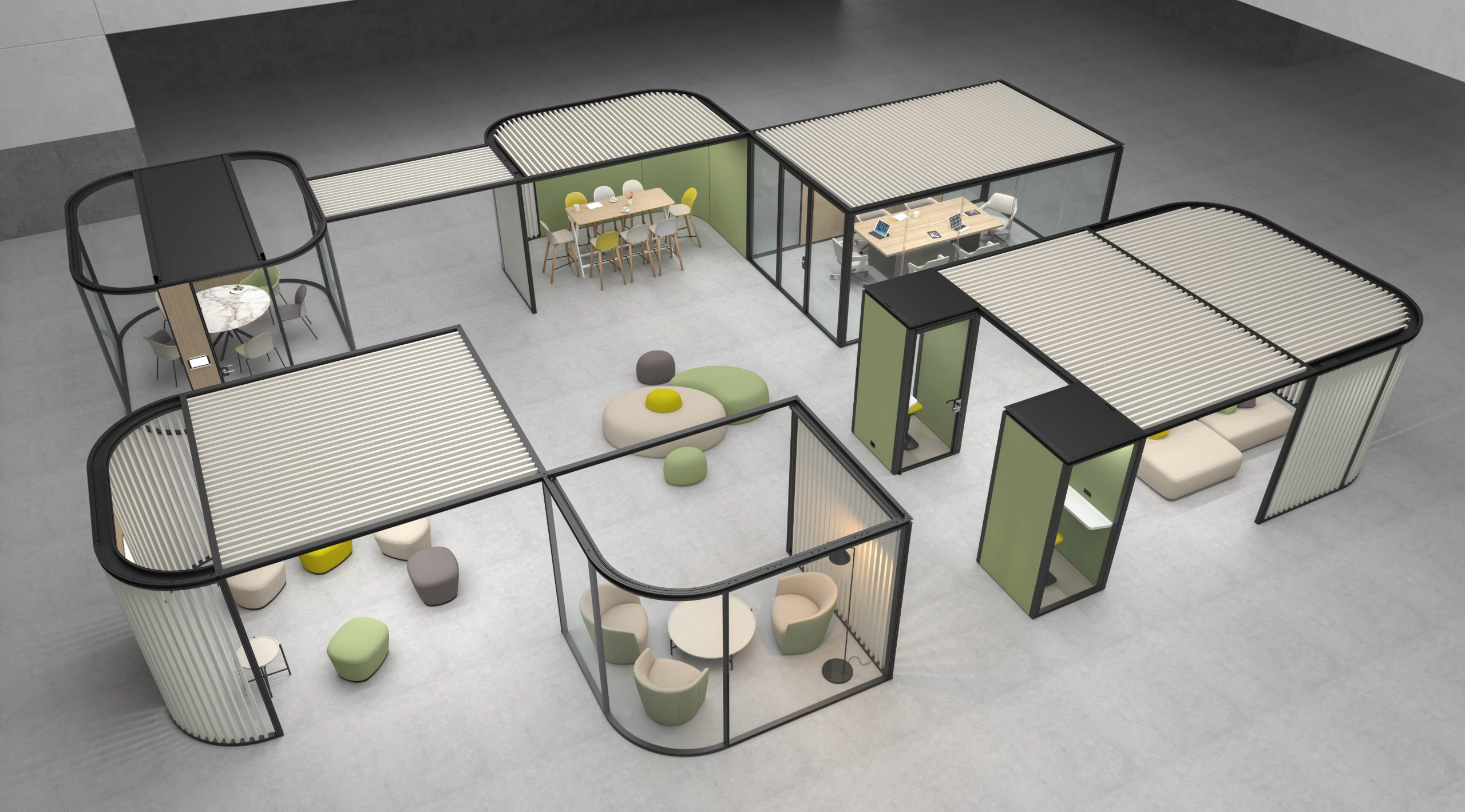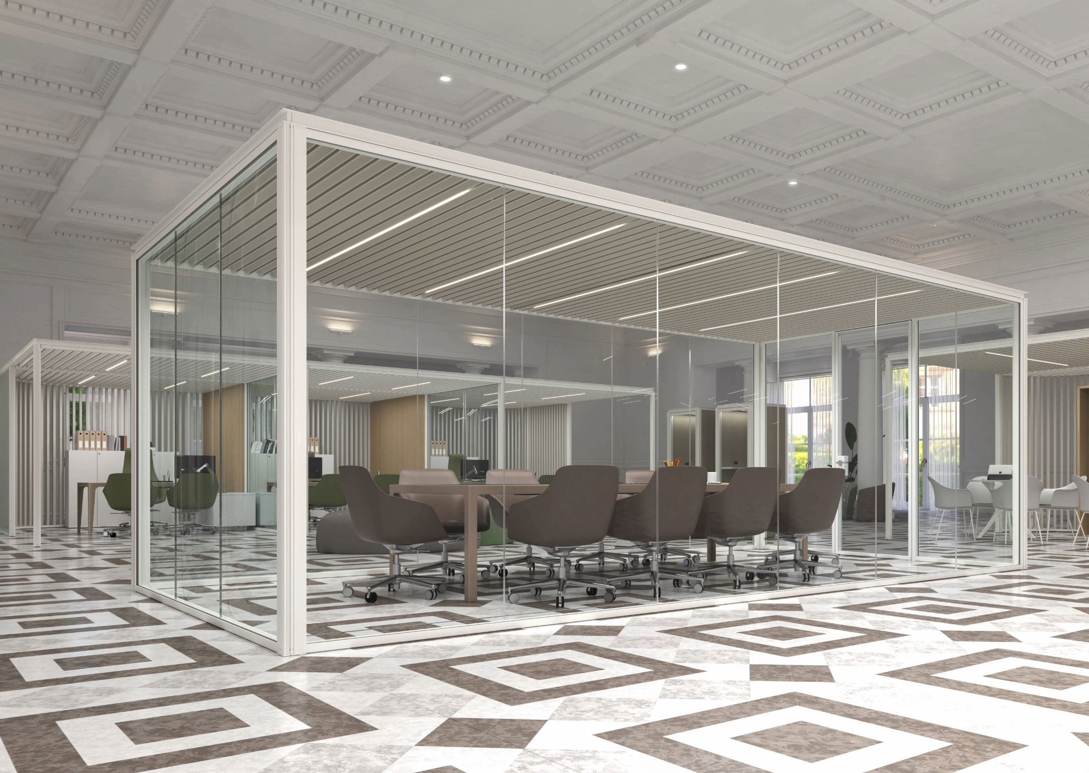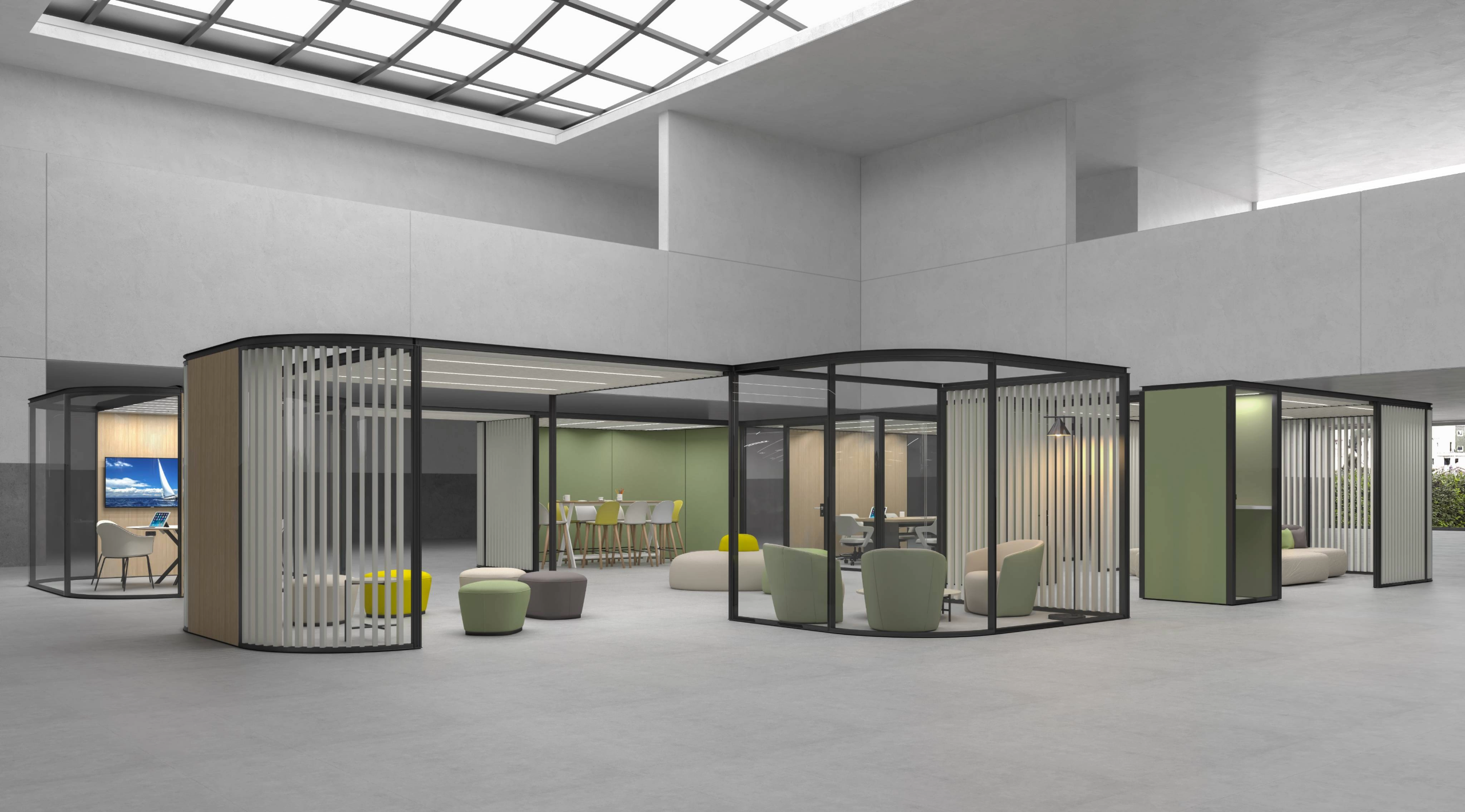 Campiello offre un’interazione flessibile tra gli spazi, grazie alla sua versatilità di utilizzo: i pannelli possono essere montati sia verticalmente, per realizzare pareti, sia orizzontalmente, per creare soffitti con le doghe Terrace. Il risultato è un ambiente dinamico e multifunzionale, capace di evolversi secondo le esigenze lavorative e creative, e che definisce quelle aree ibride formali ed informali sempre più richieste agli space planners.