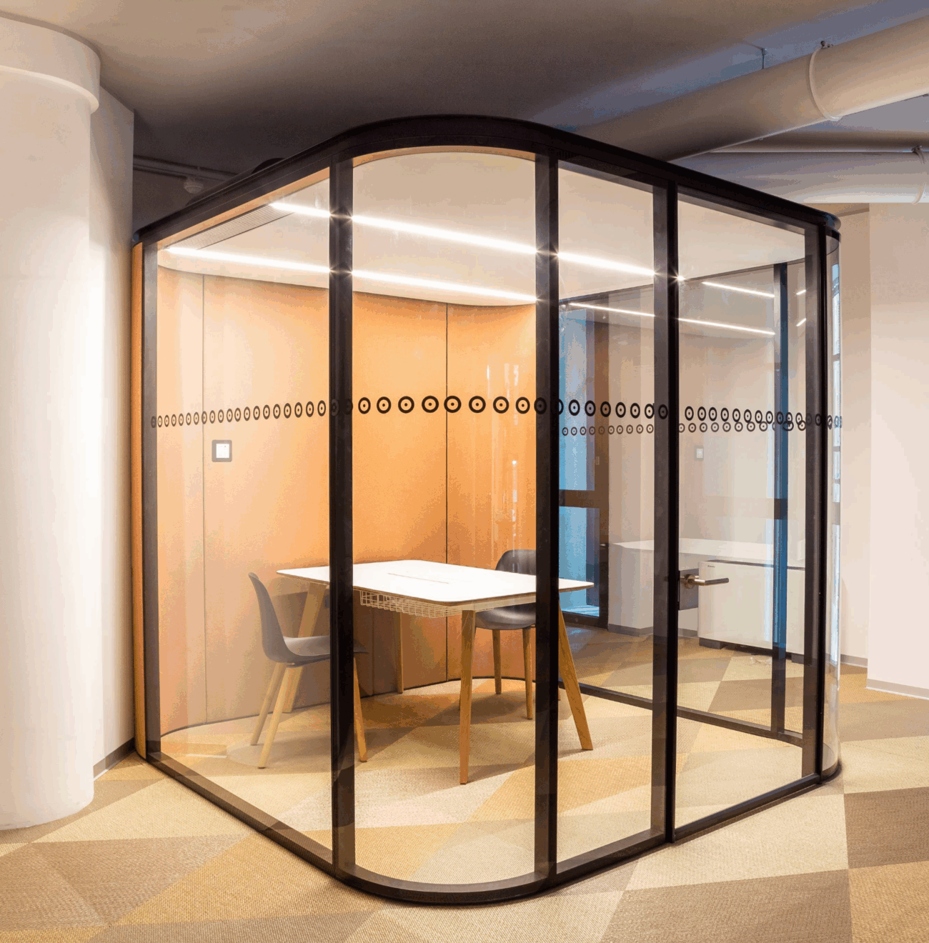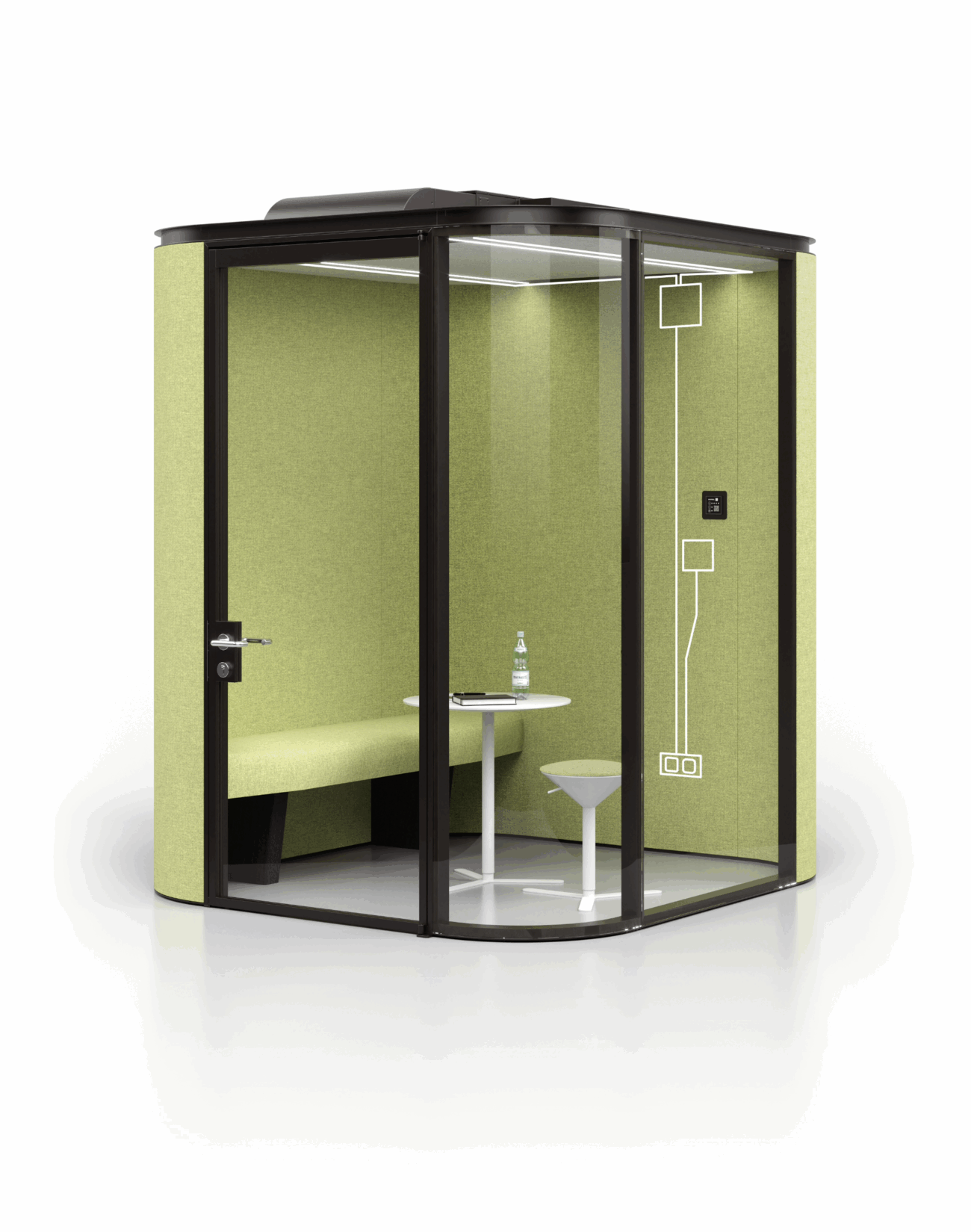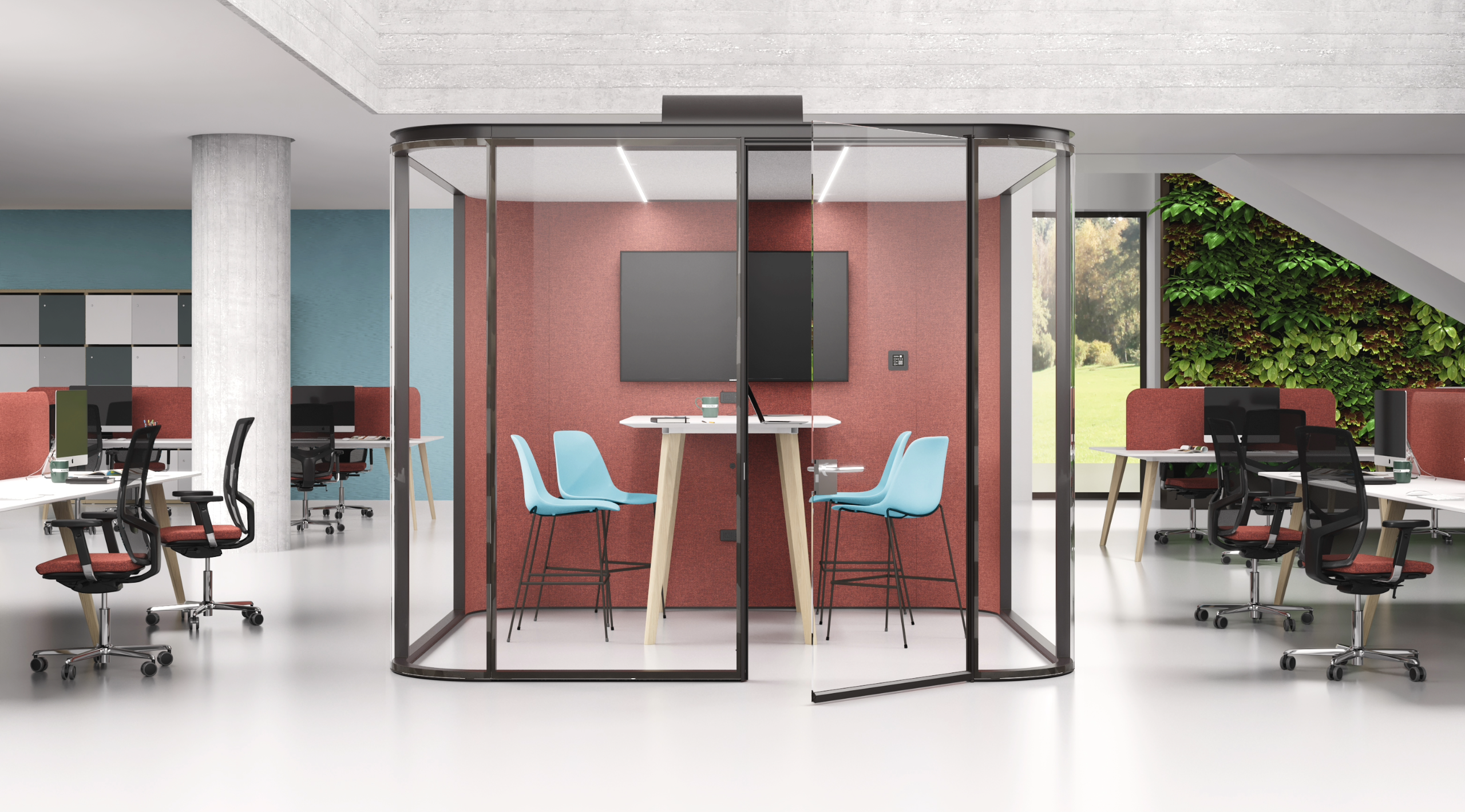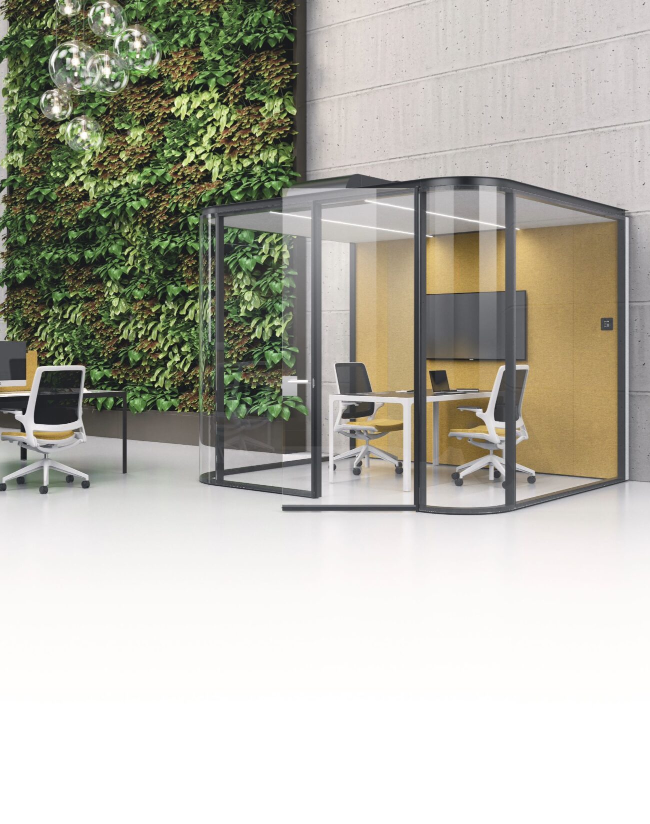 Il Collaborative Room si può posizionato anche a parete: in questo caso gli angoli a parete saranno retti. La versione da 295×247 cm – arredata nel modo giusto – è un perfetto ufficio operativo, per tutte quelle attività che necessitano di privacy e isolamento acustico.