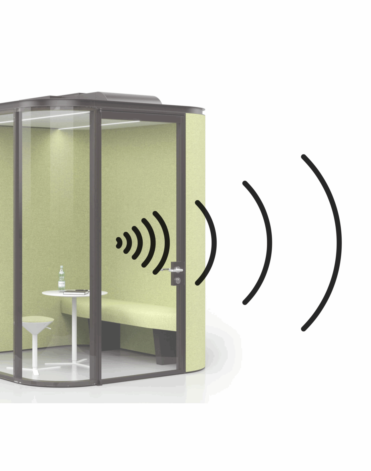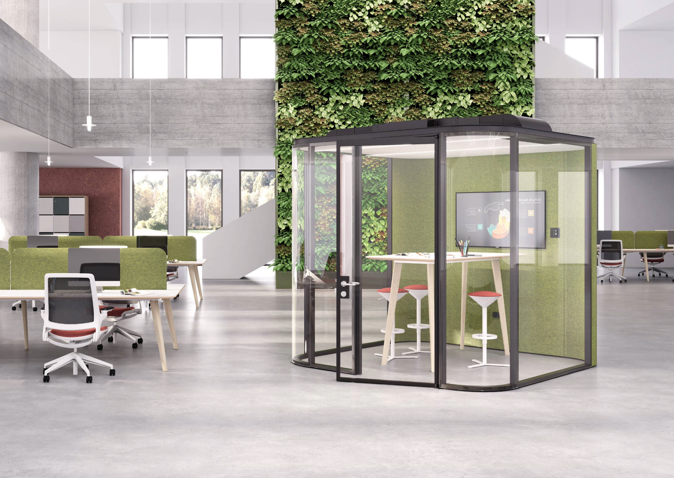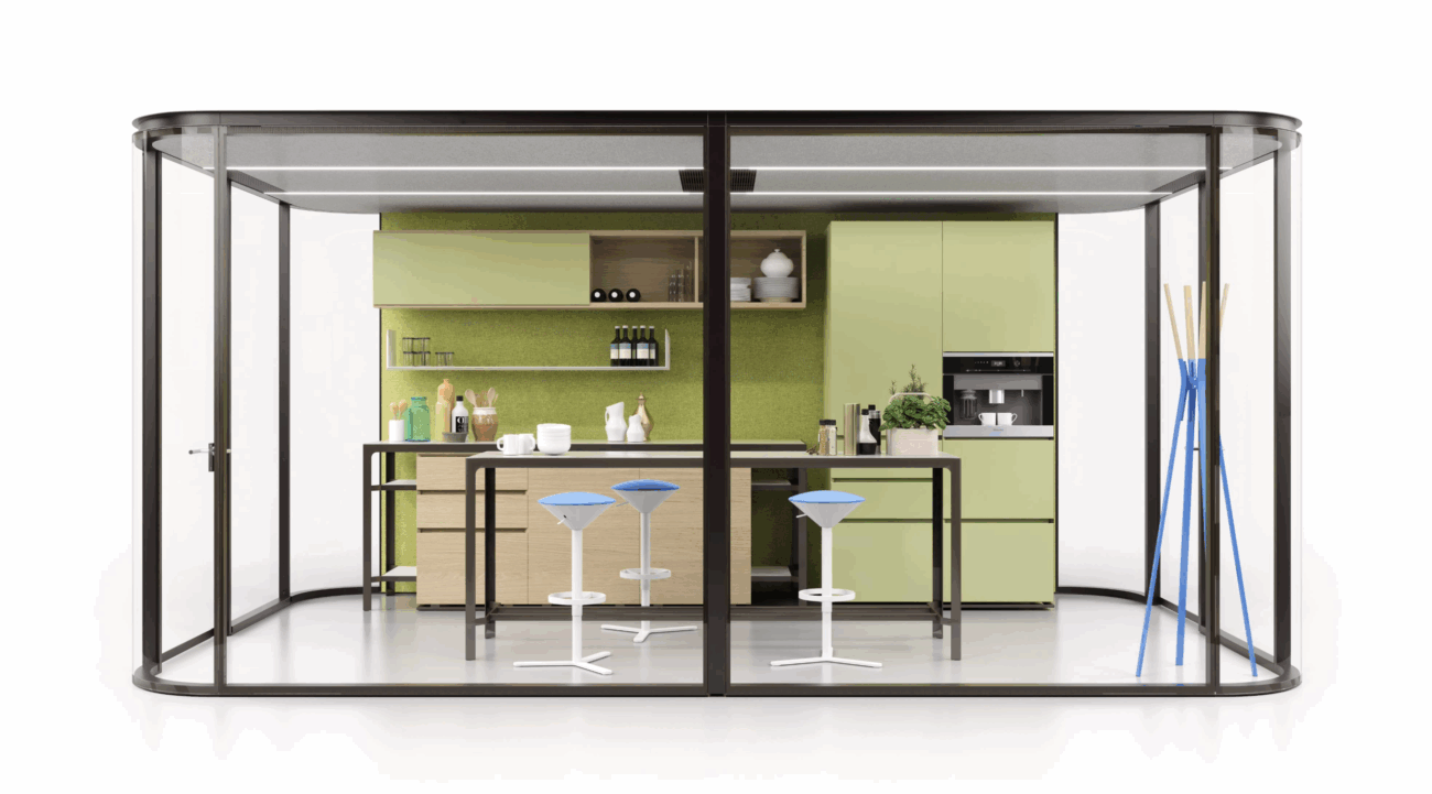 Il Collaborative Room si può posizionato anche a parete: in questo caso gli angoli a parete saranno retti. La versione da 295×247 cm – arredata nel modo giusto – è un perfetto ufficio operativo, per tutte quelle attività che necessitano di privacy e isolamento acustico.