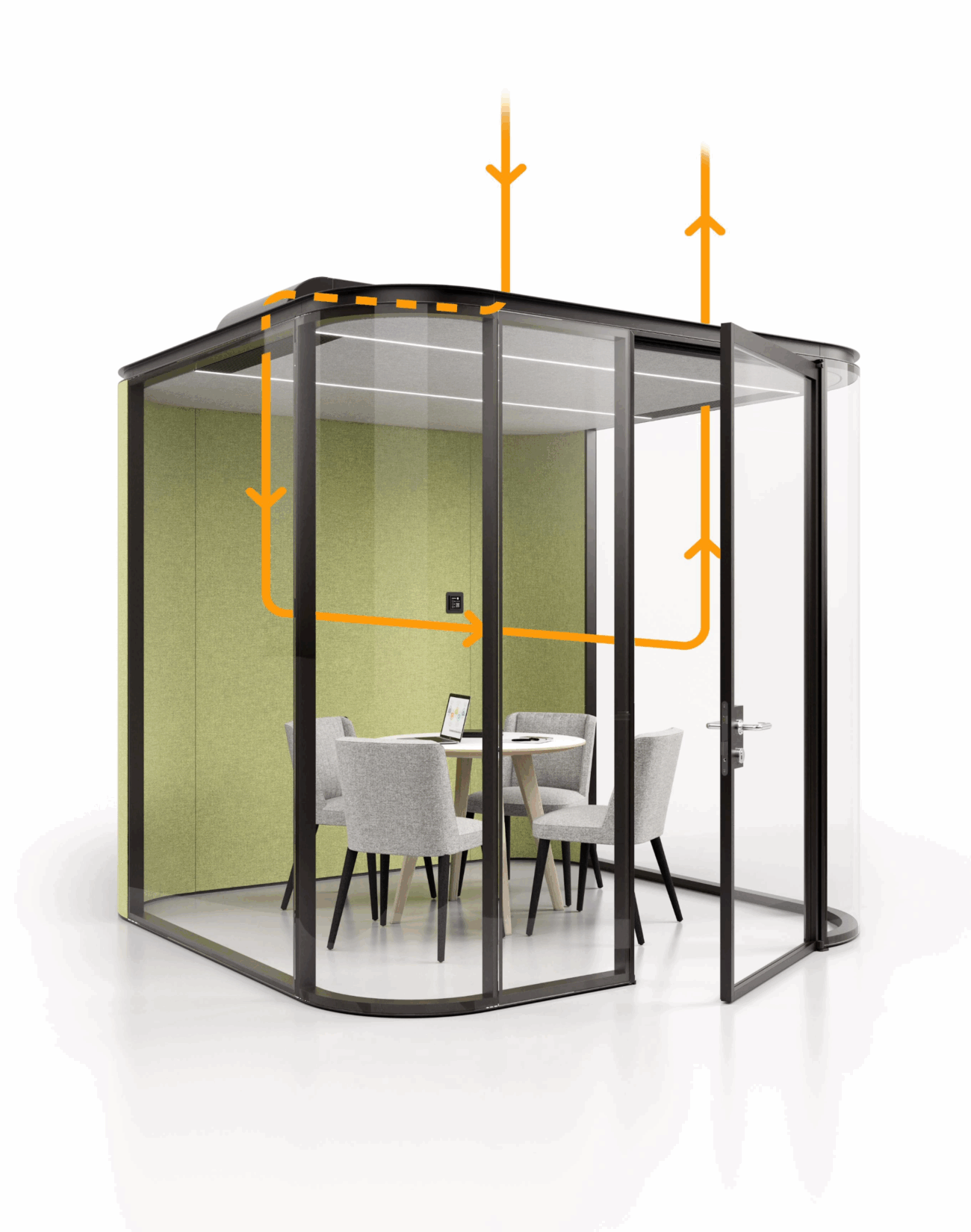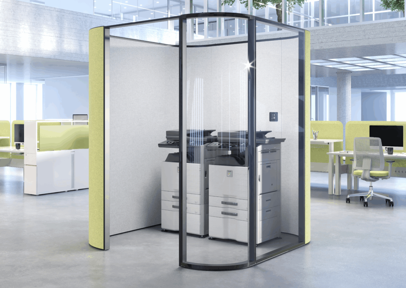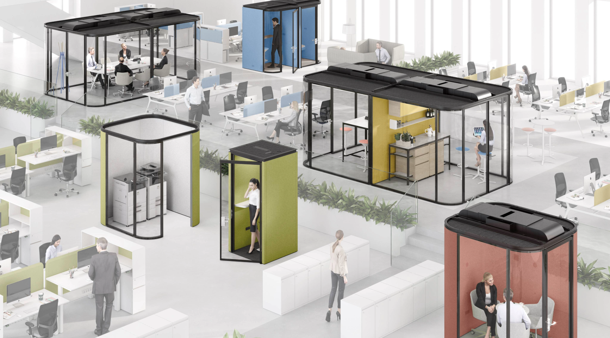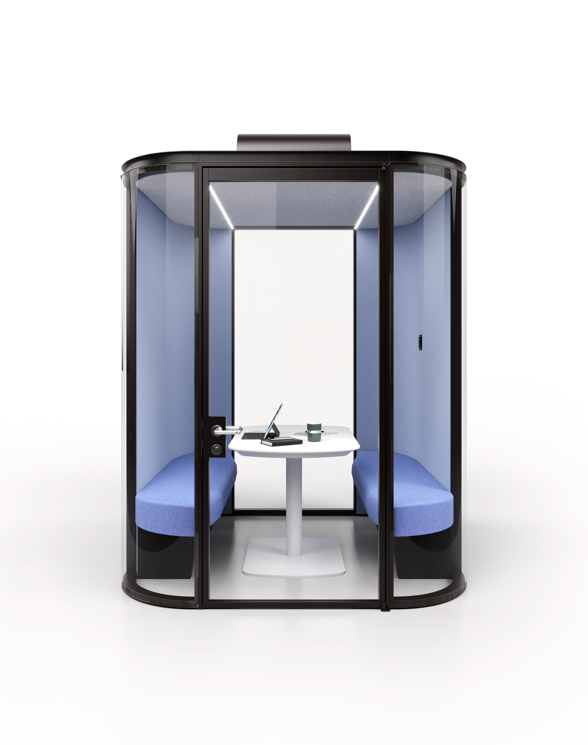 Il Collaborative Room si può posizionato anche a parete: in questo caso gli angoli a parete saranno retti. La versione da 295×247 cm – arredata nel modo giusto – è un perfetto ufficio operativo, per tutte quelle attività che necessitano di privacy e isolamento acustico.