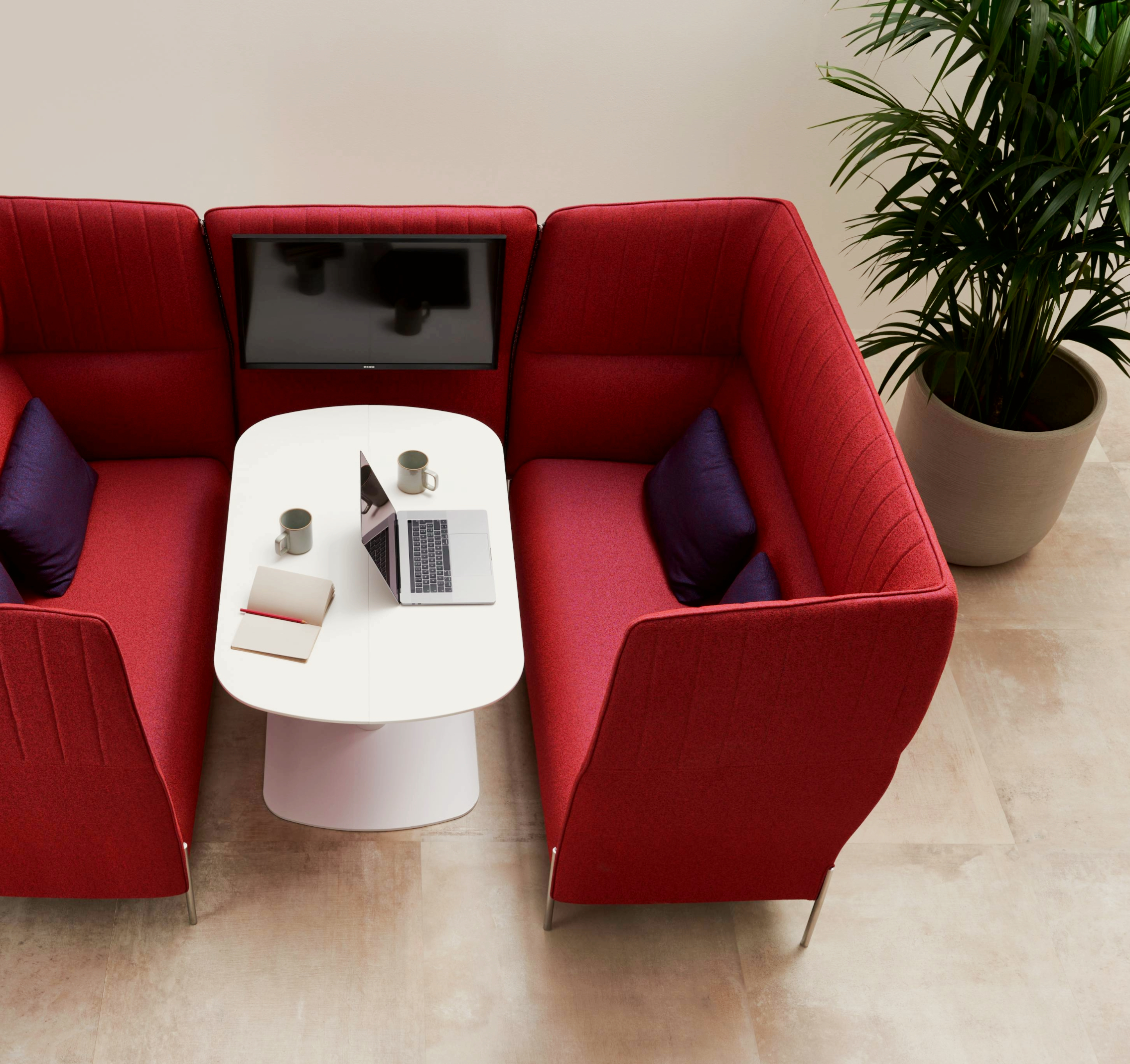 La versione Dolly Chat da 2/4 posti, accessoriata con tavolino estensibile elettrificato, è ideale per mini riunioni.