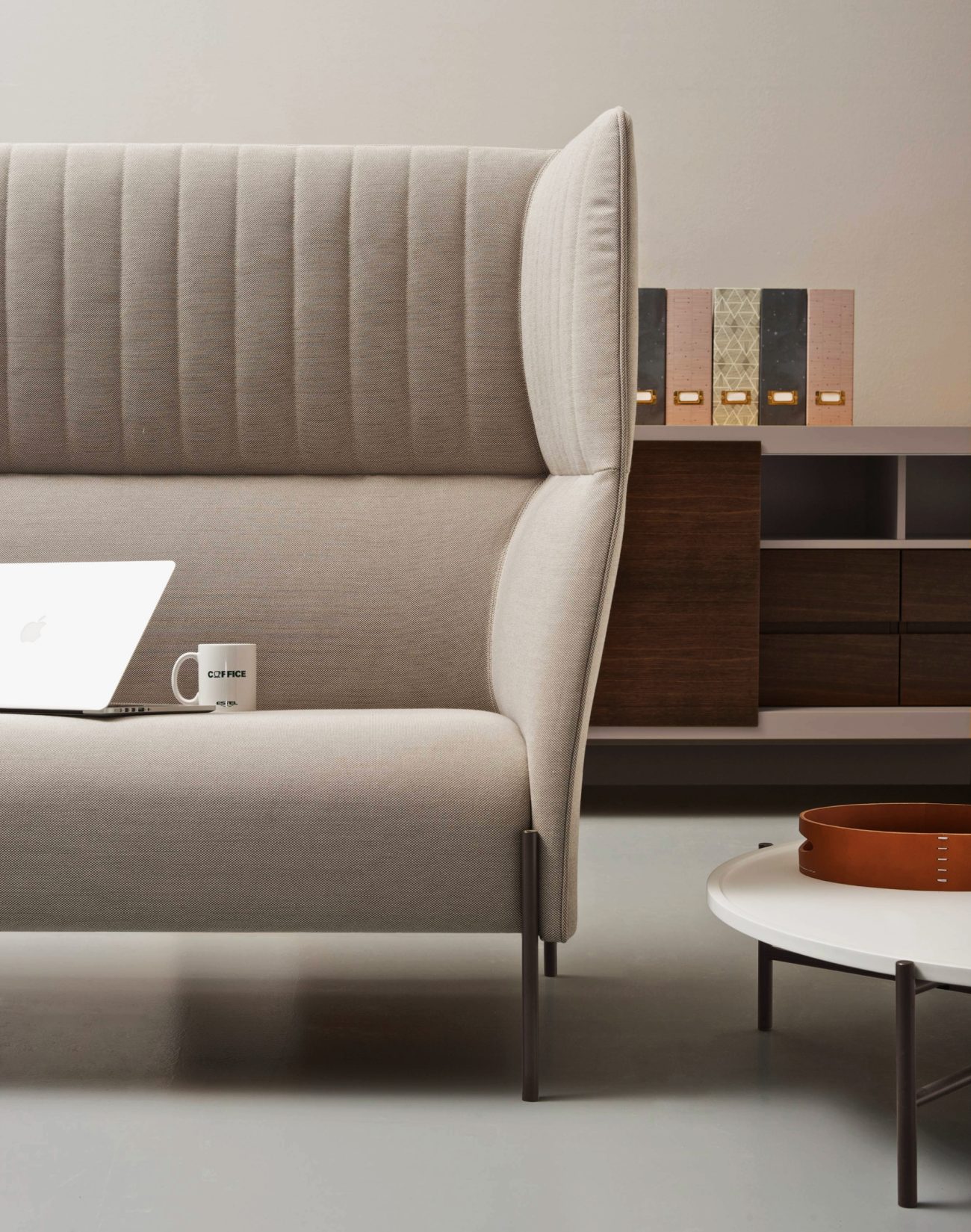 La composizione è costituita da due divanetti imbottiti alti 130 cm collegati da un pannello tecnico,