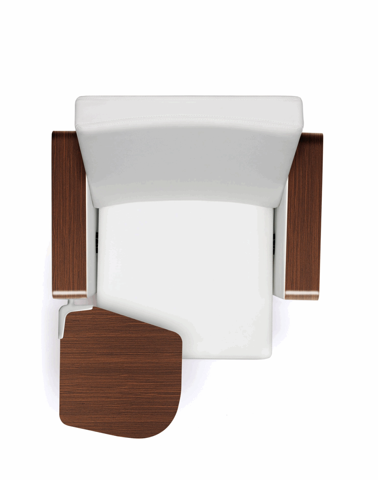 Domino nell’elegante configurazione con retroschienale in multistrato di wengè e braccioli in massello, nella stessa essenza. La tavoletta scrittoio, dotata di meccanismo antipanico, ha il supporto in alluminio e il piano di scrittura in laminato stratificato. Scompare con un semplice movimento all’interno del bracciolo.