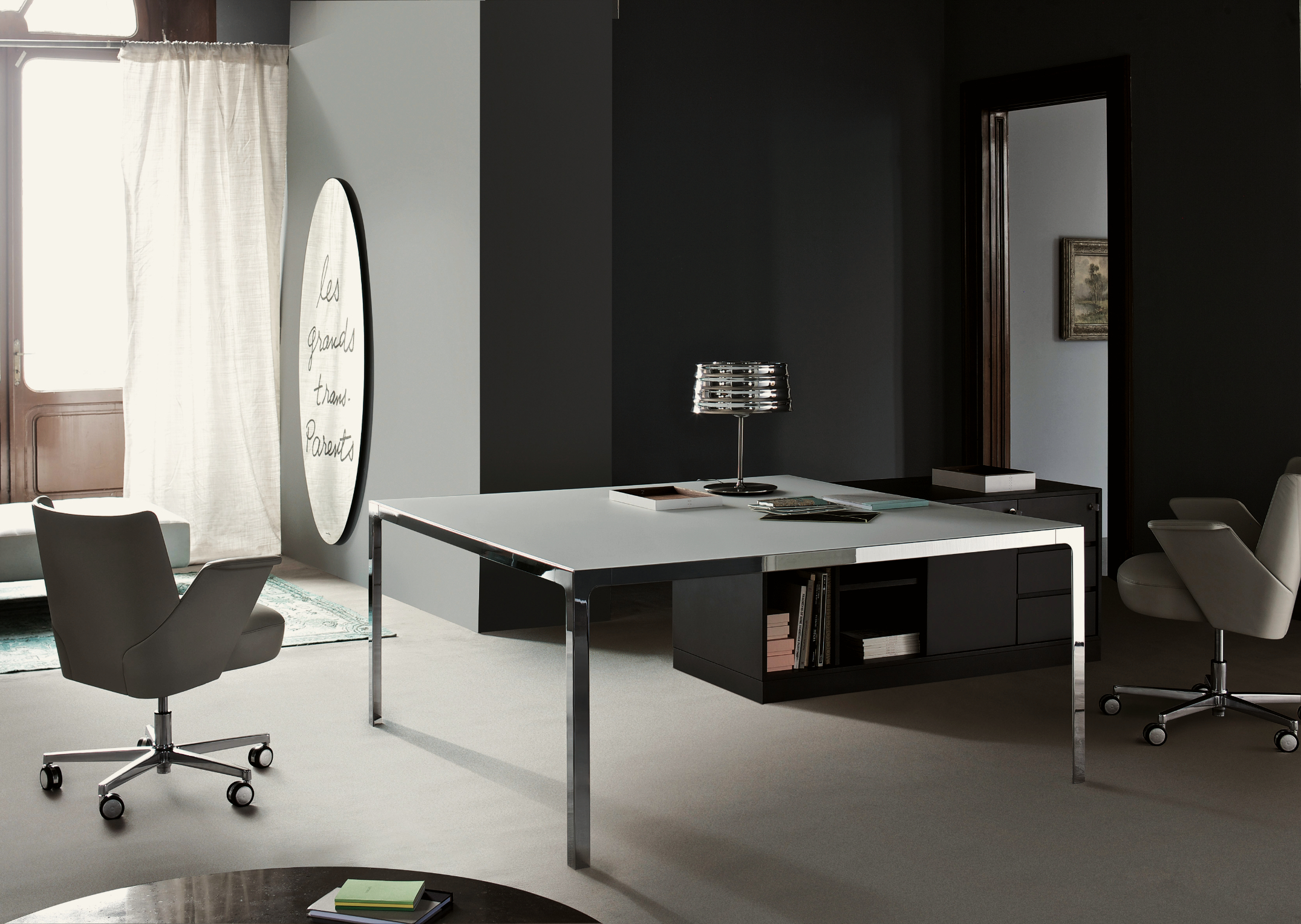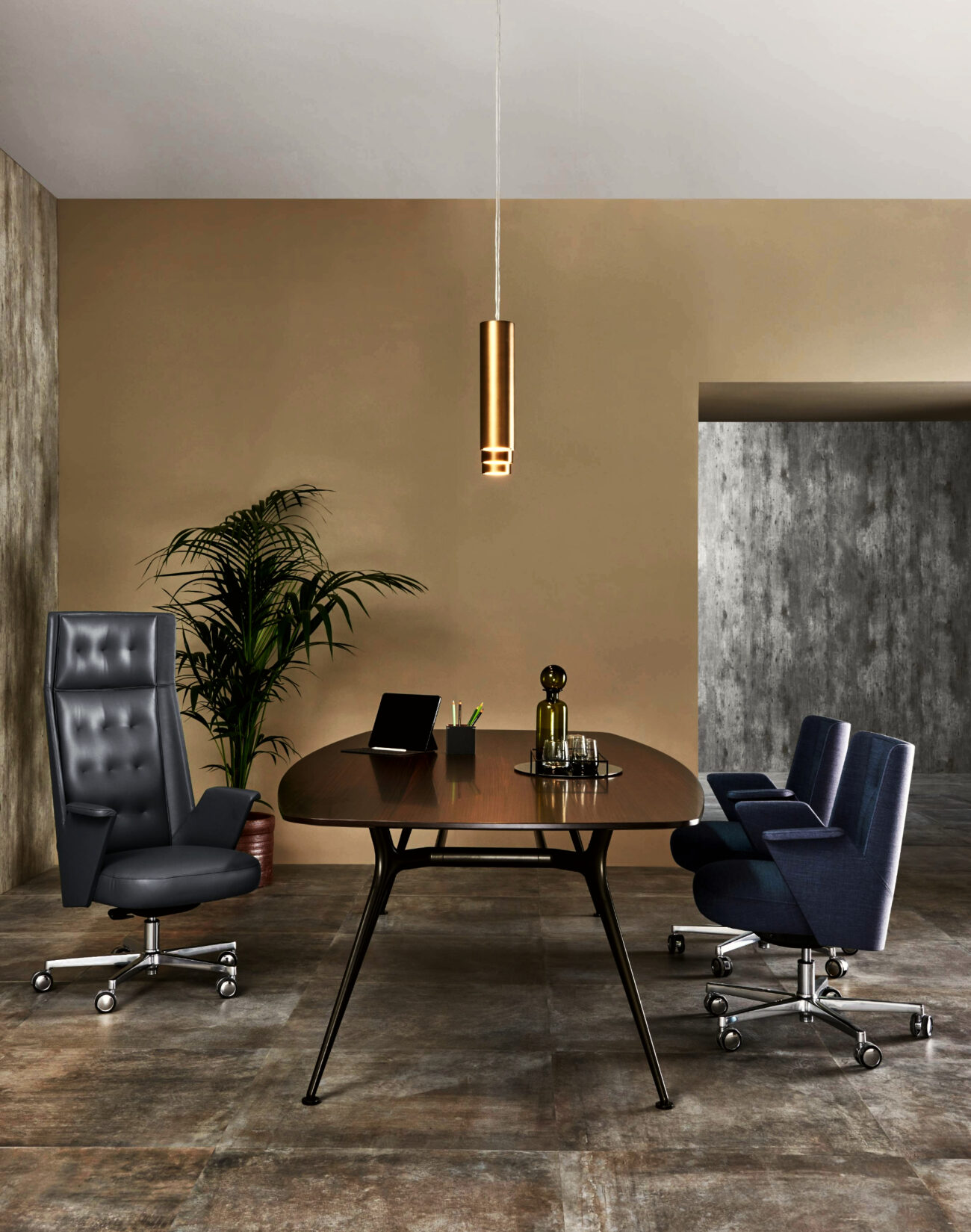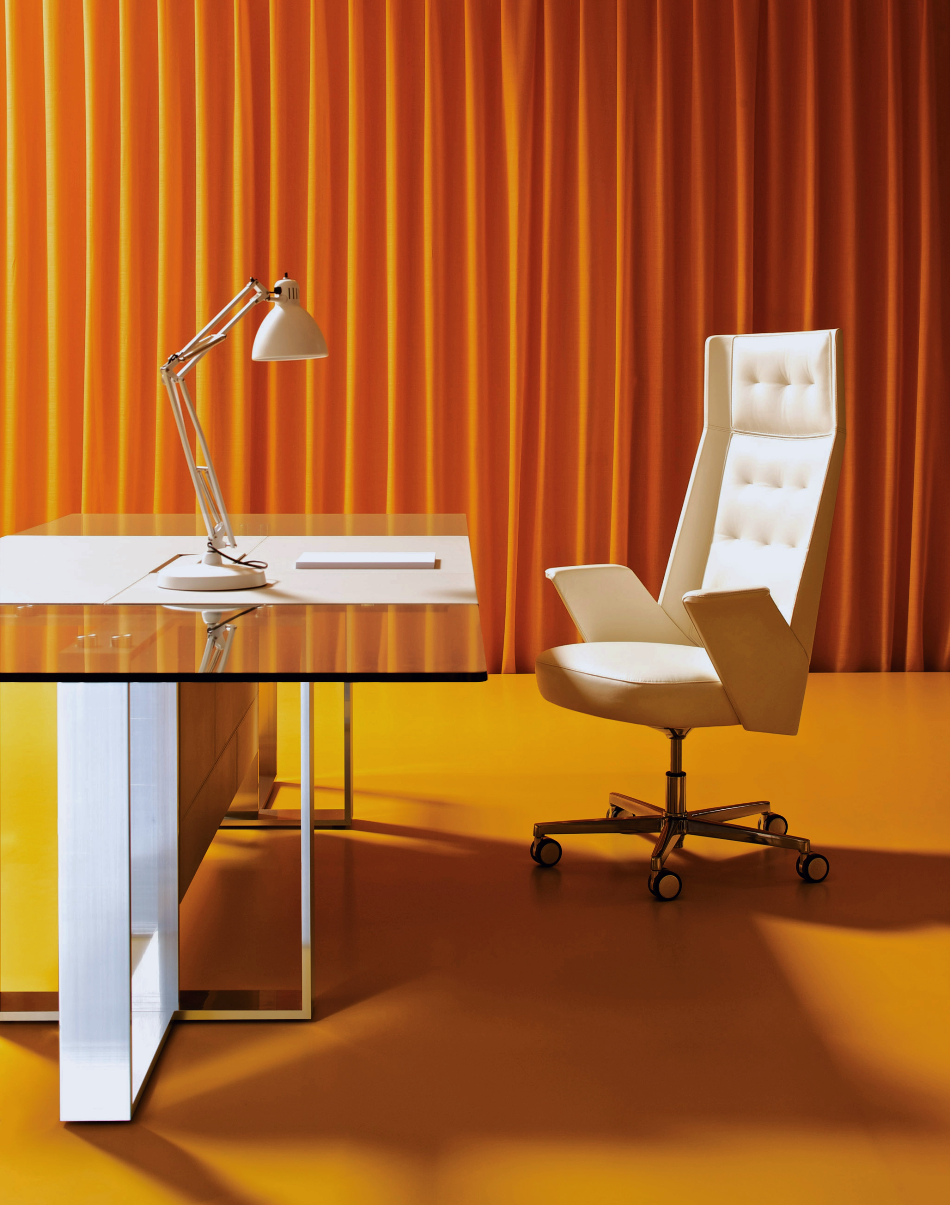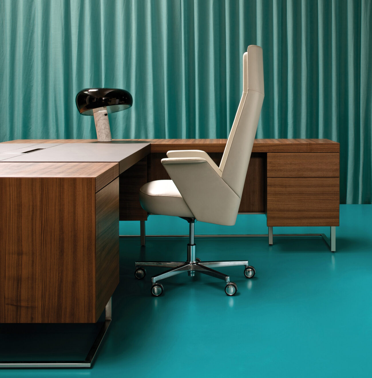 Le sedute da lavoro, realizzate con struttura portante in multistrato, sono caratterizzate da un design avvolgente ed organico, spezzato da linee tese per un comfort di alto livello.
