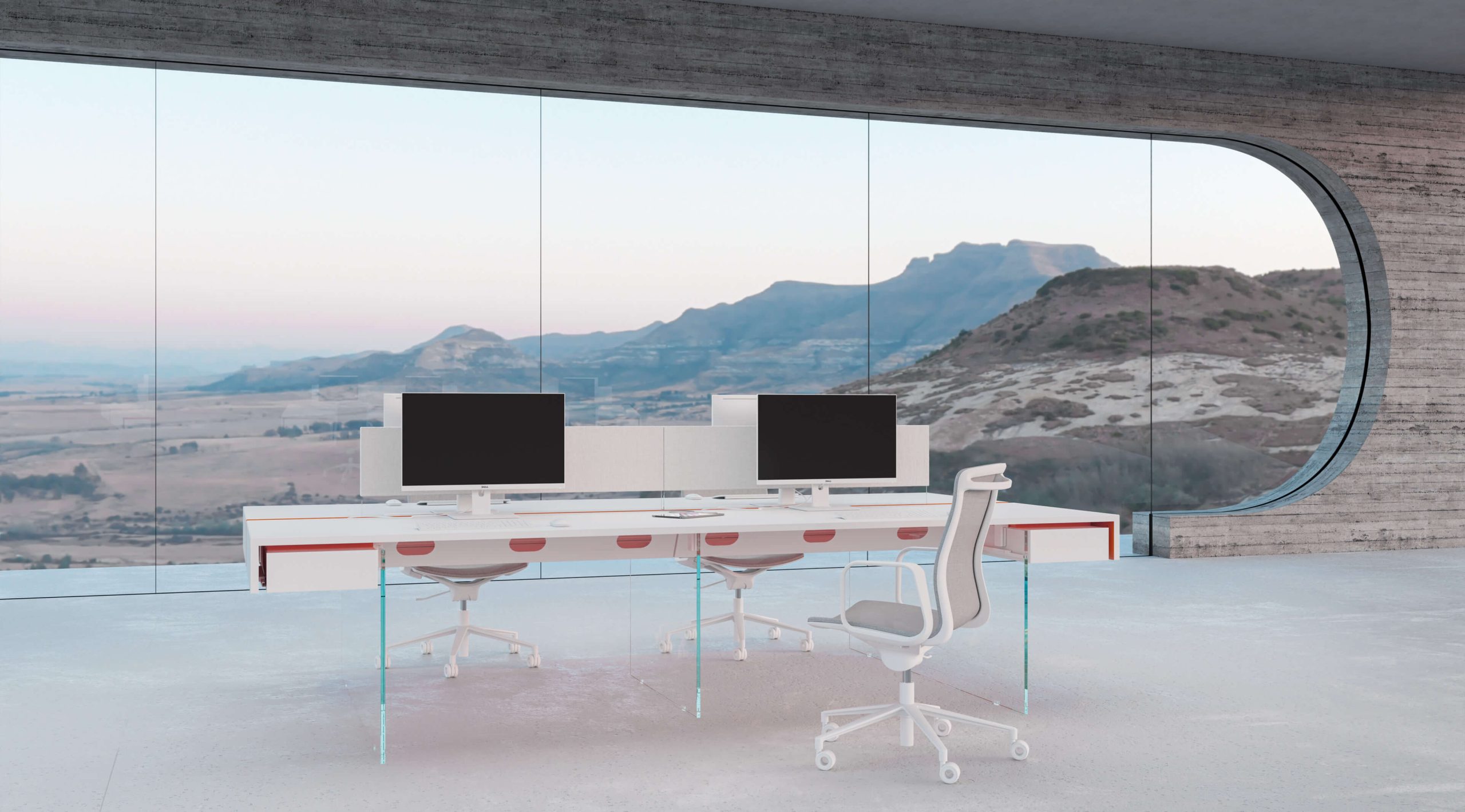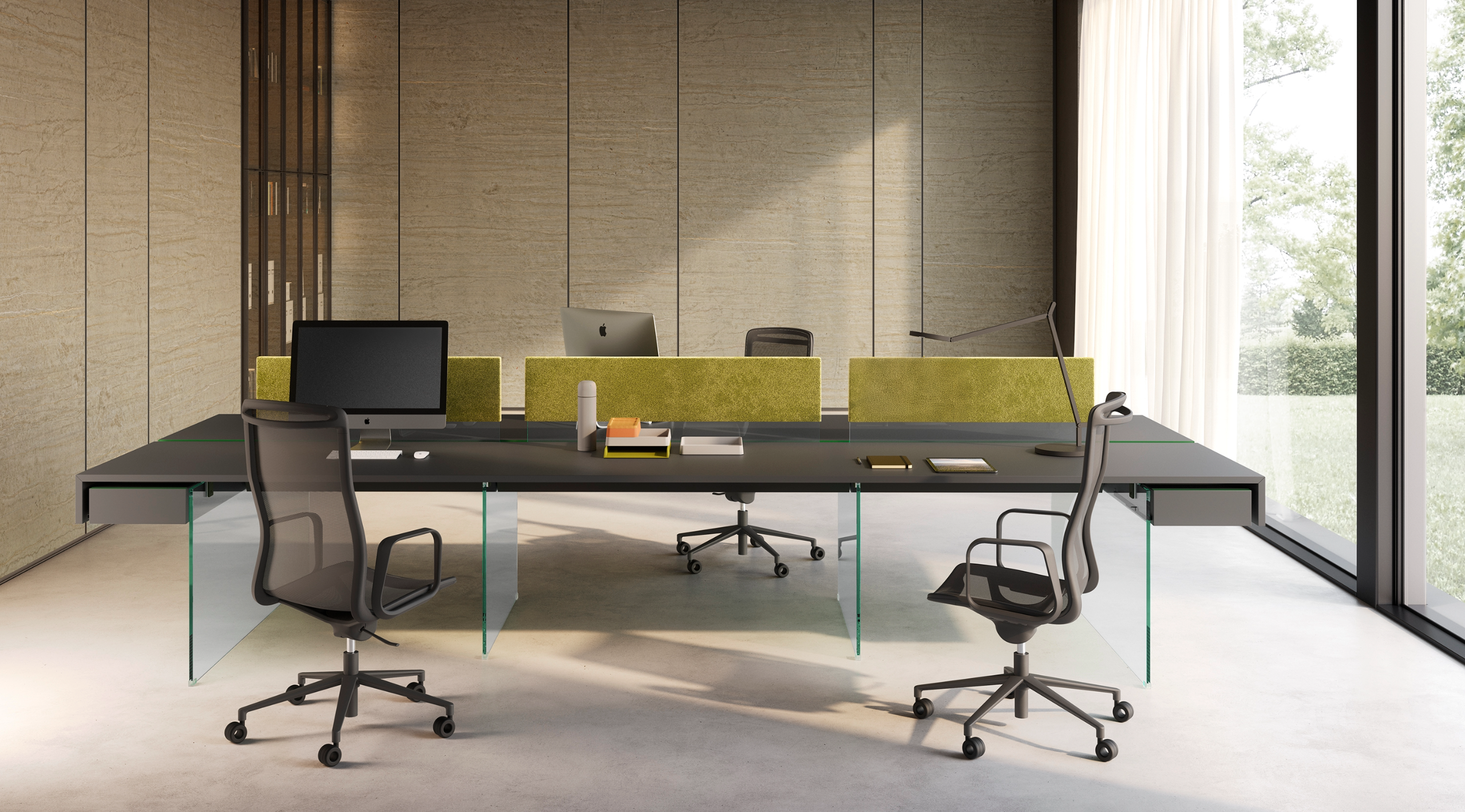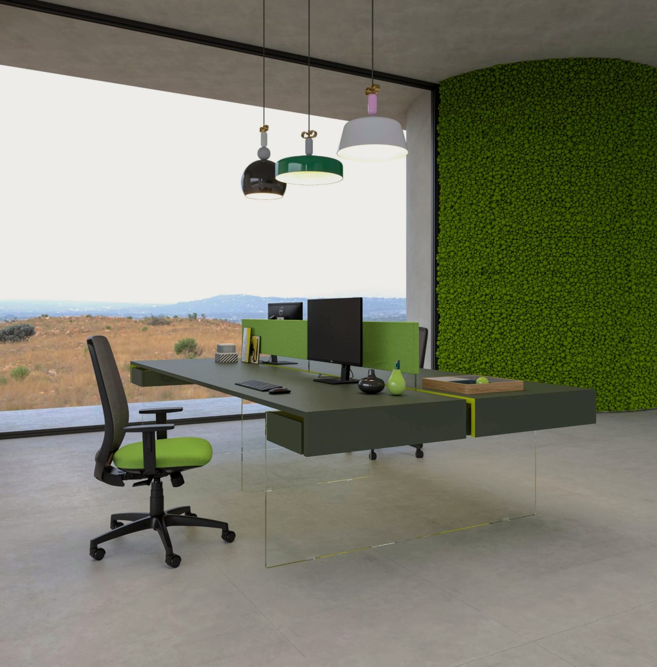 Il sostegno laterale in vetro crea un’illusione ottica: la scrivania sembra fluttuare