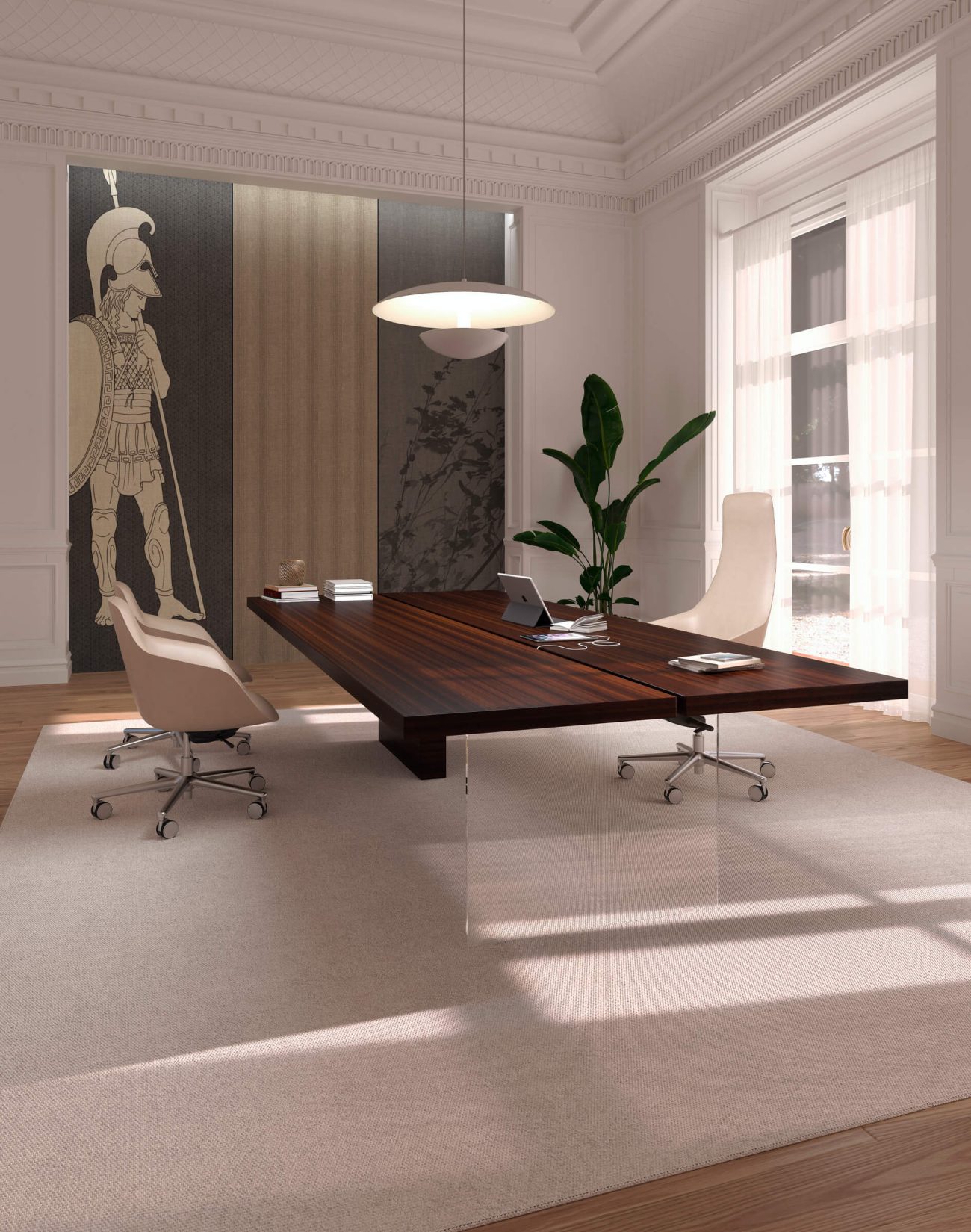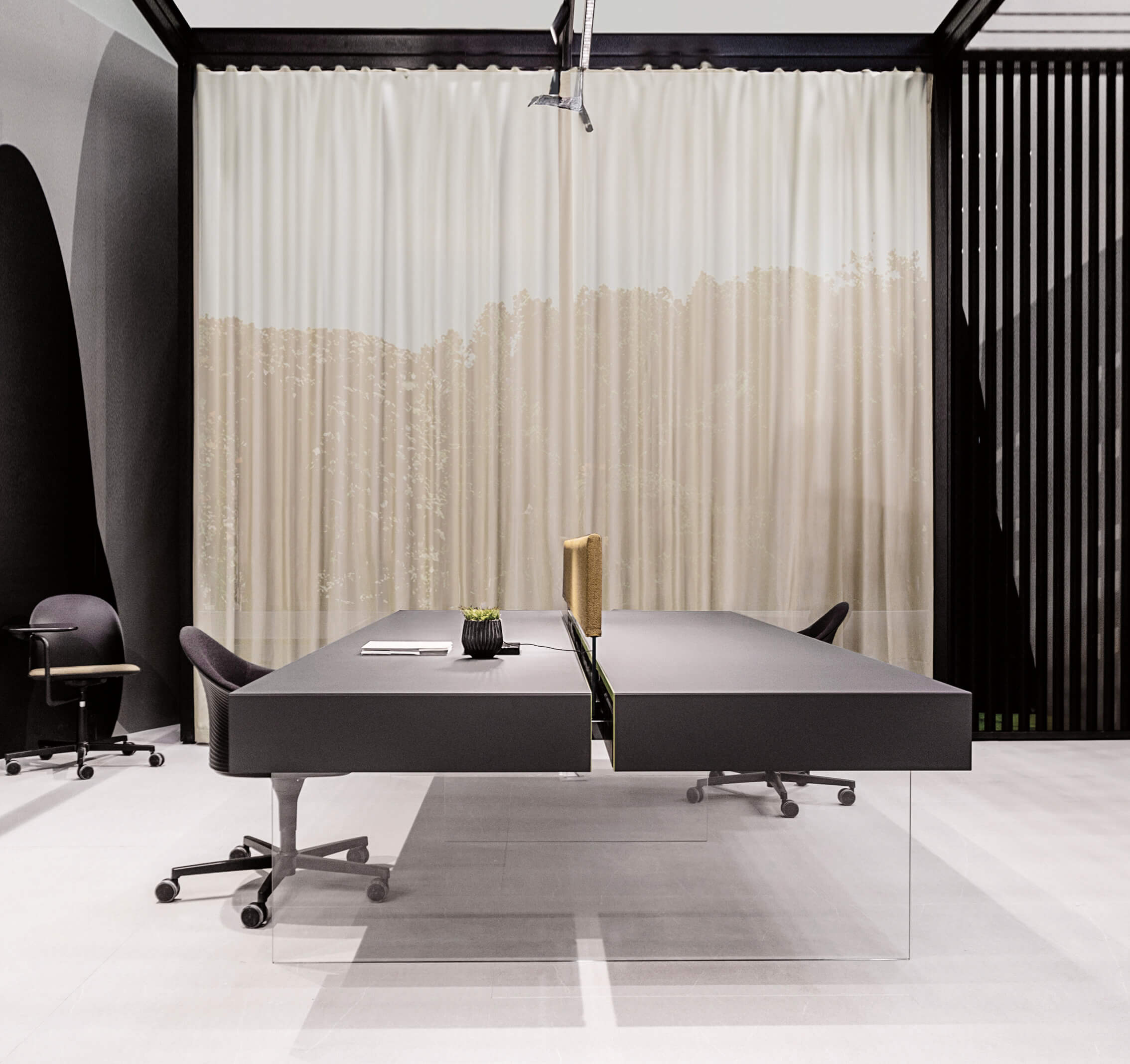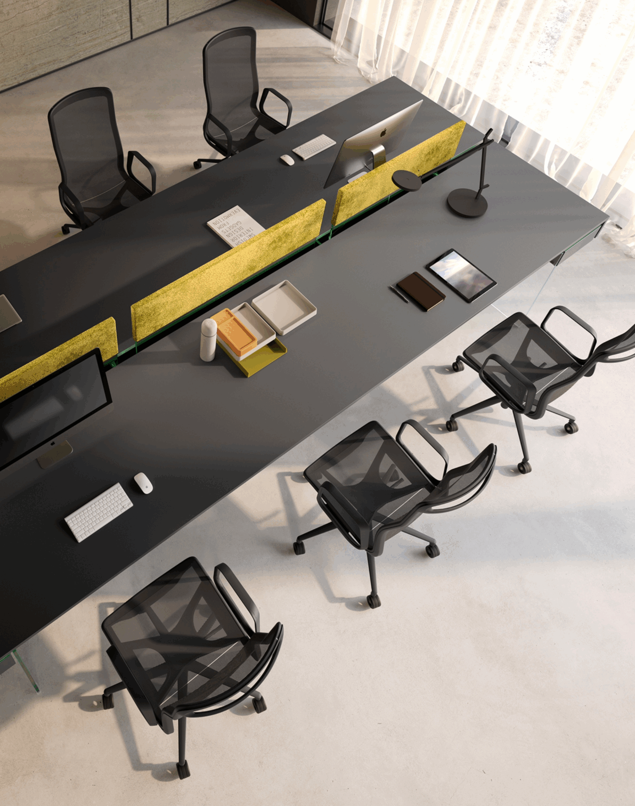 Il sostegno laterale in vetro crea un’illusione ottica: la scrivania sembra fluttuare