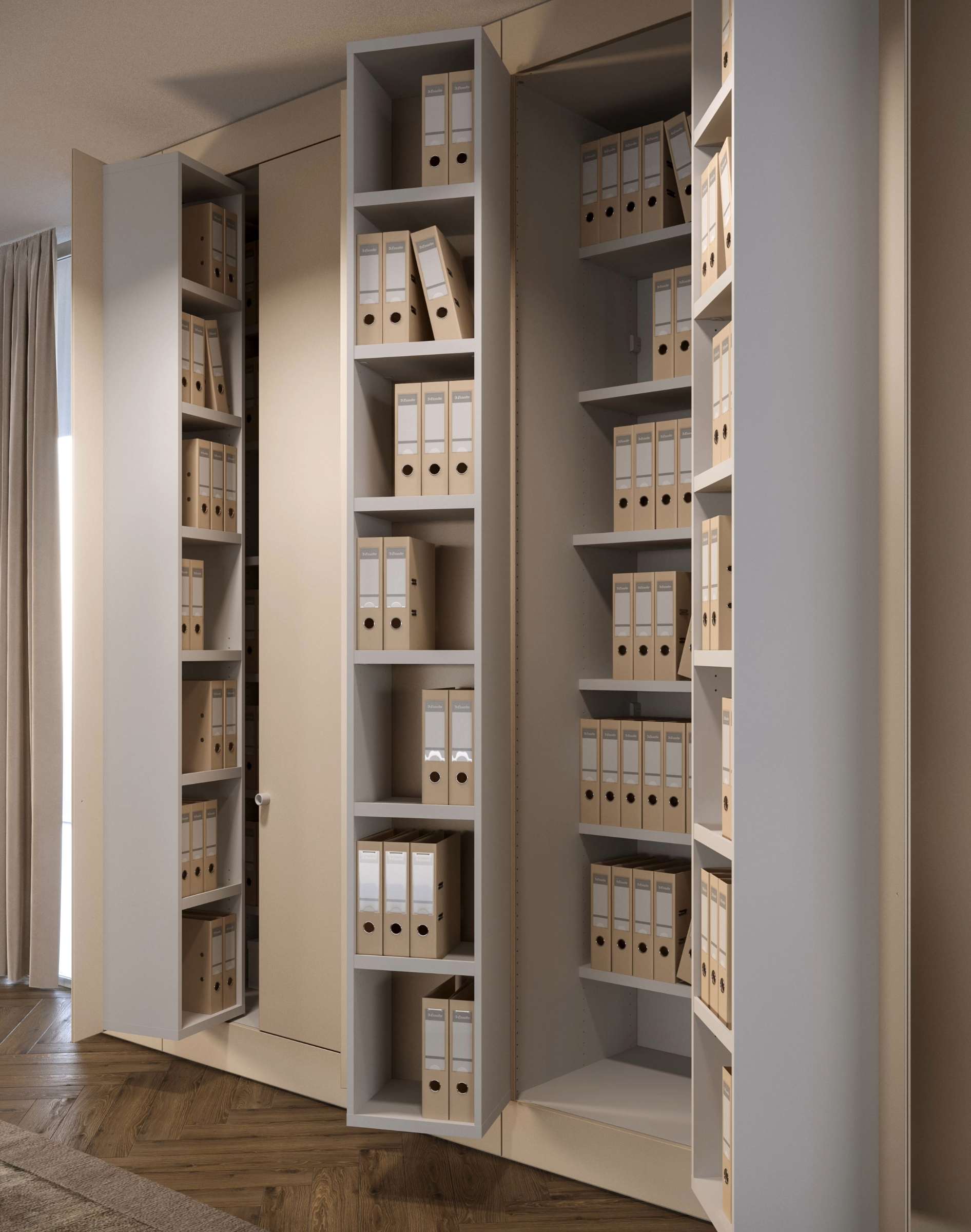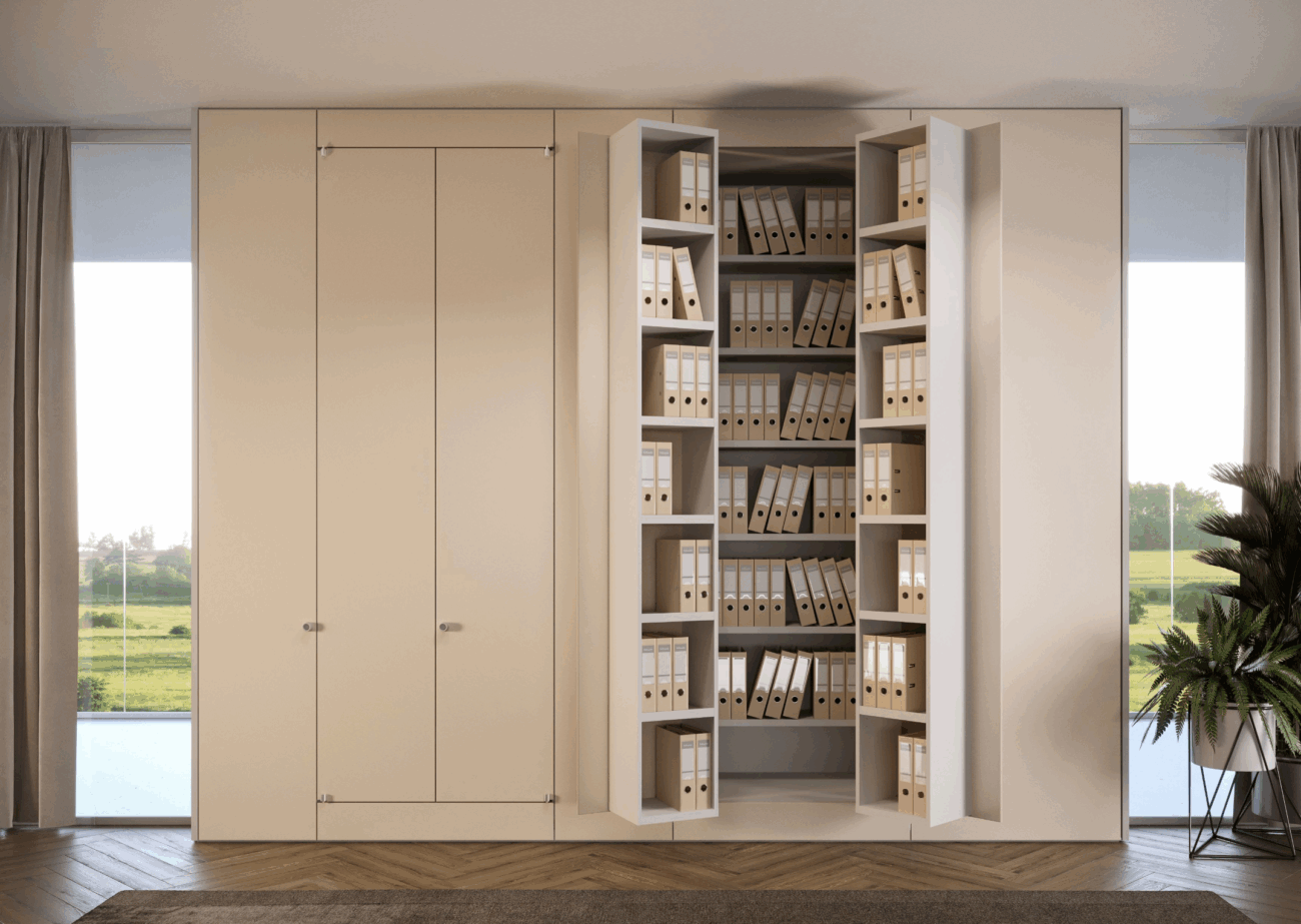 La soluzione con ante Reverso che ruotano a 180° raddoppia lo spazio contenitivo delle pareti attrezzate: le ante