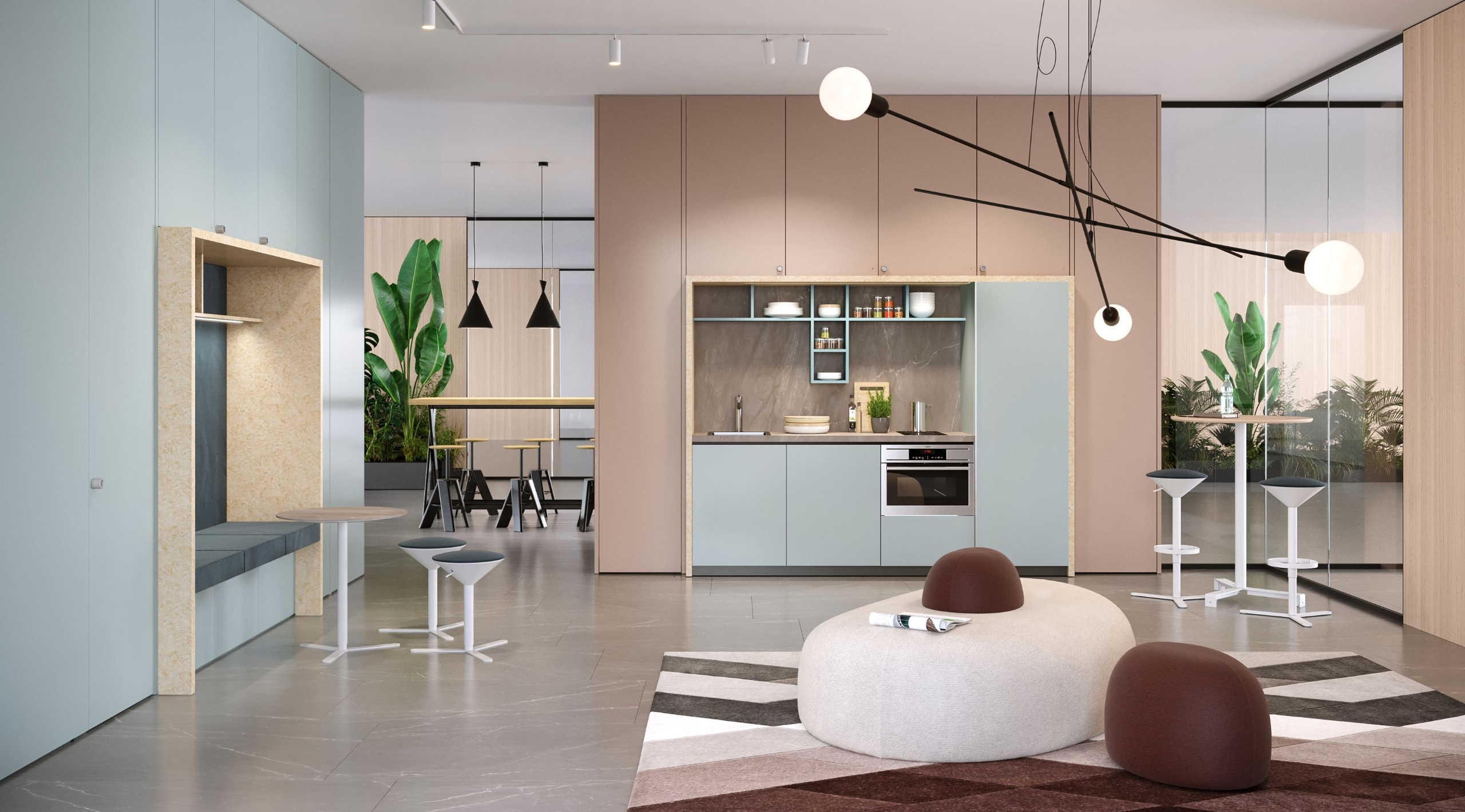 con nicchie attrezzate come modulo cucina e tavoli al posto delle scrivanie formano ambienti dal sapore domestico.