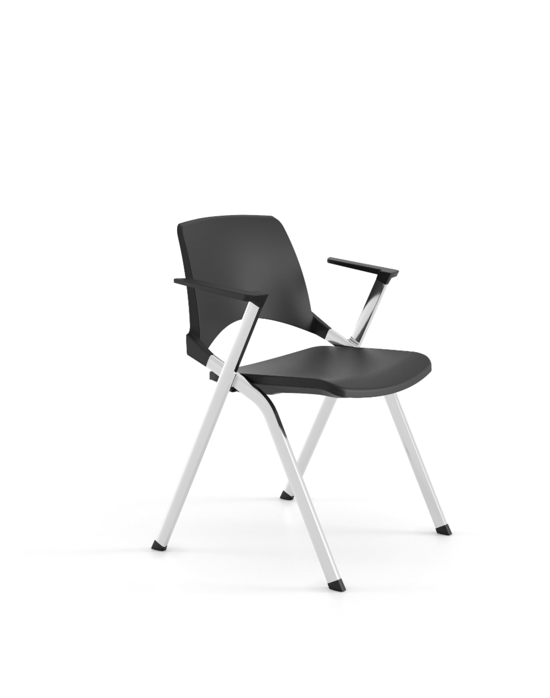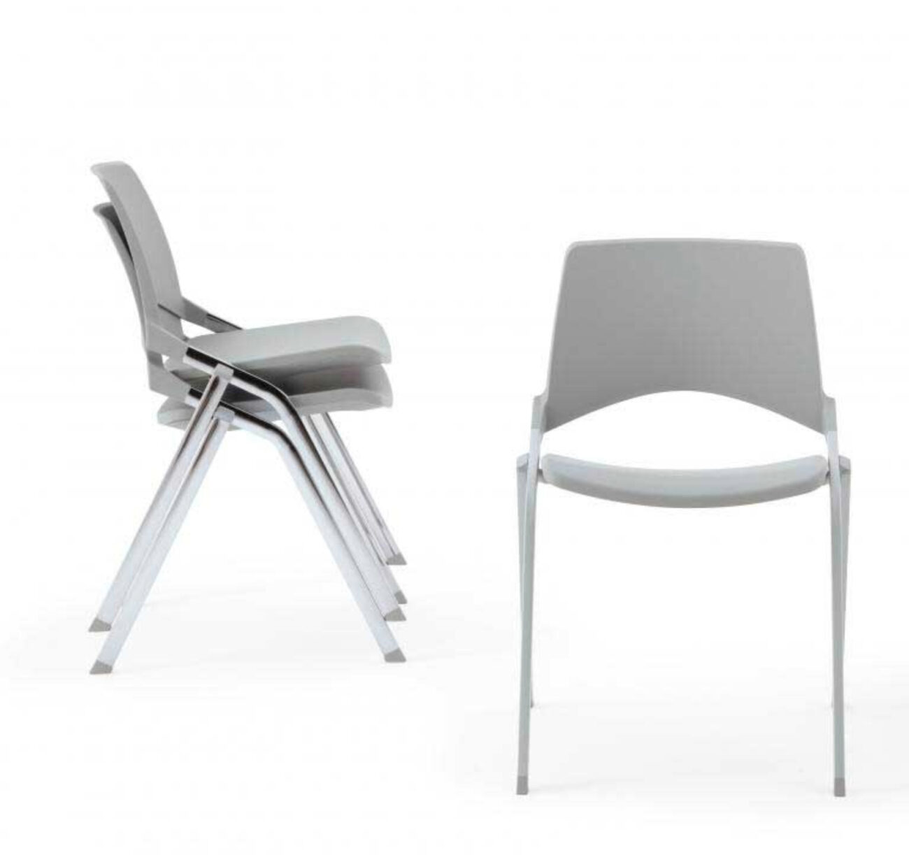 È formata da un telaio metallico con seduta e schienale in plastica, e si può impilare agevolmente sia in verticale che in orizzontale.