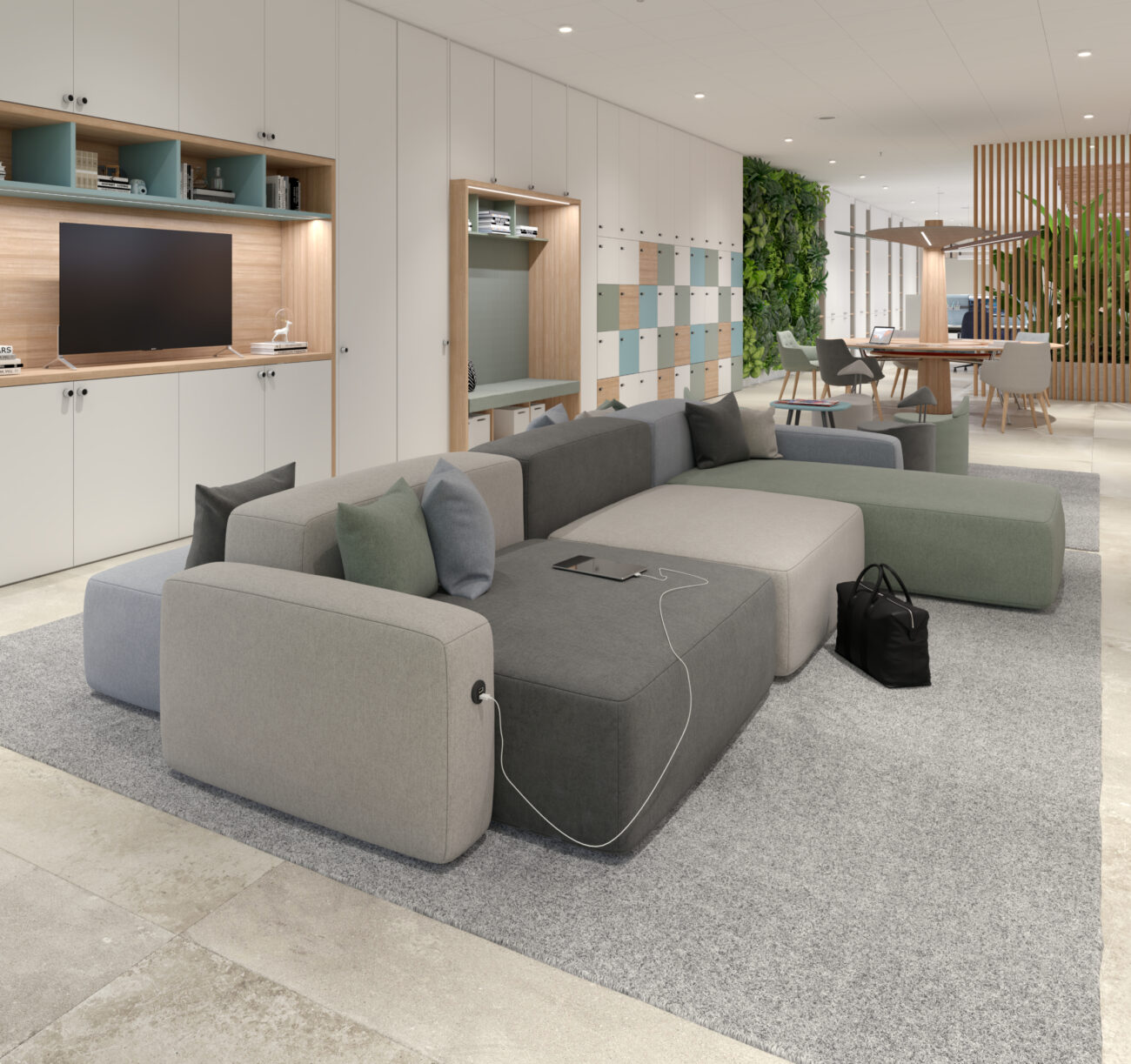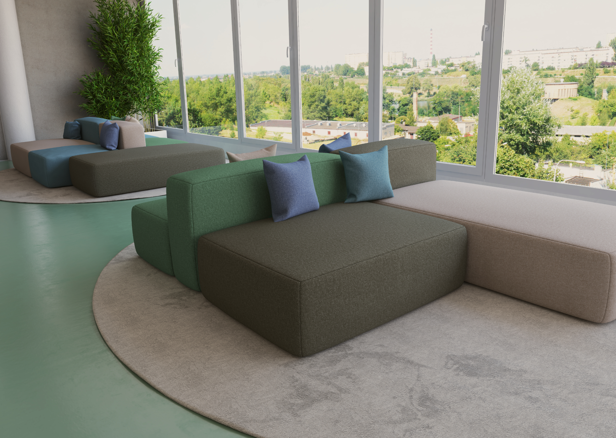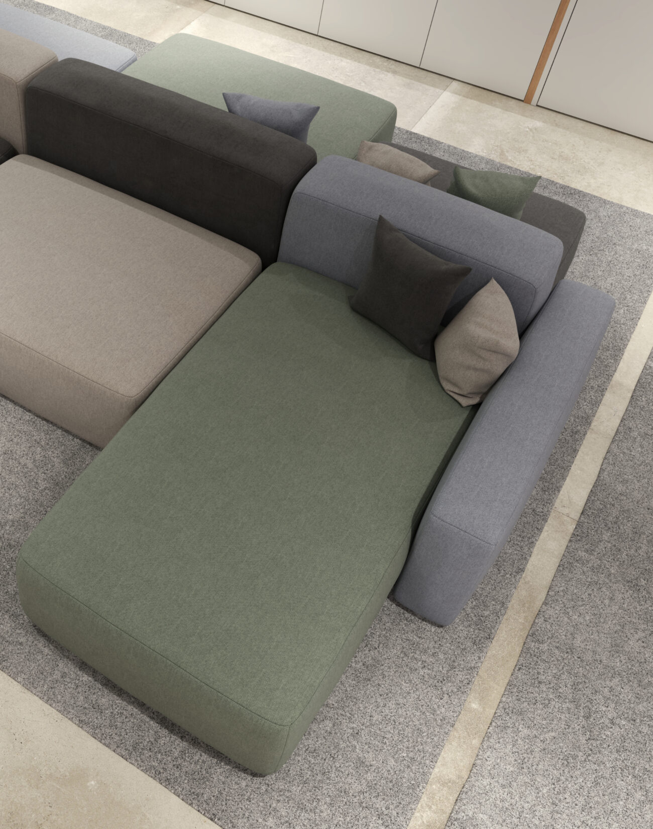 Sistema di sofa molto facile da comporre, con pochi pezzi.