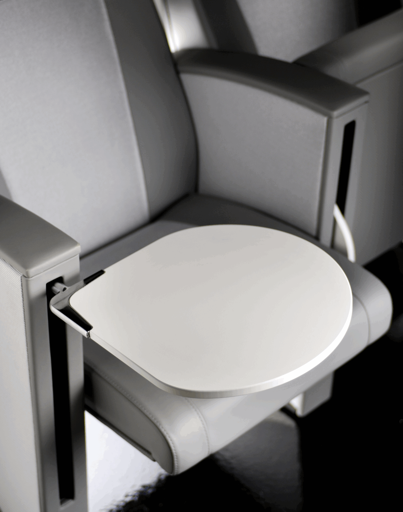 La poltrona Musa può essere configurata con diversi accessori che ne ampliano le funzionalità e il comfort. È disponibile con tavoletta ribaltabile antipanico, installabile sia a destra che a sinistra, e può essere predisposta per l’integrazione di un video LCD da 7” posizionato sul retro dello schienale. Il bracciolo superiore, in multistrato di faggio impiallacciato in essenza wengé, aggiunge un dettaglio materico di pregio, mentre la scatola con multipresa integrata consente di gestire in modo pratico e ordinato l’alimentazione dei dispositivi elettronici.