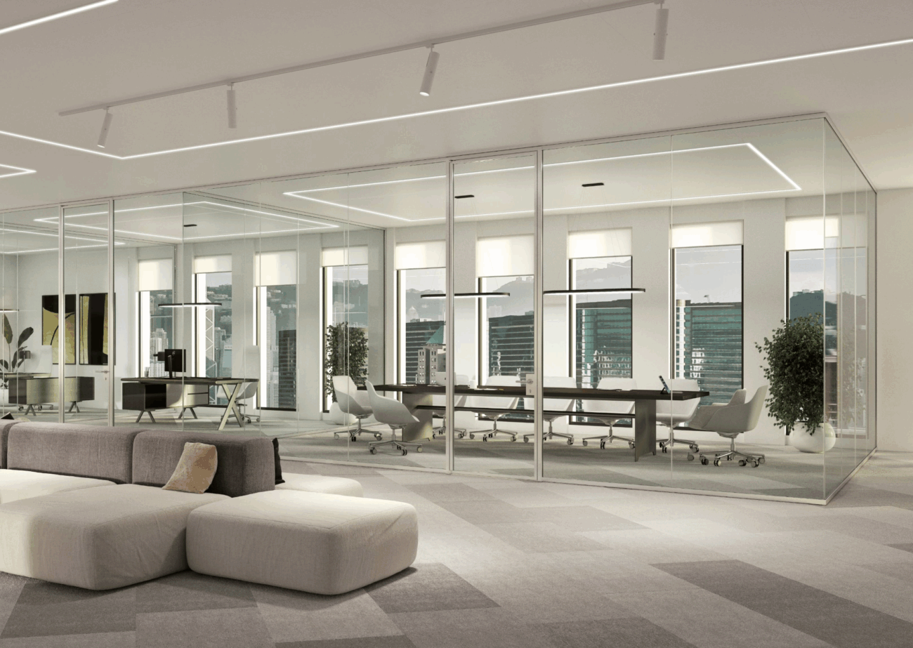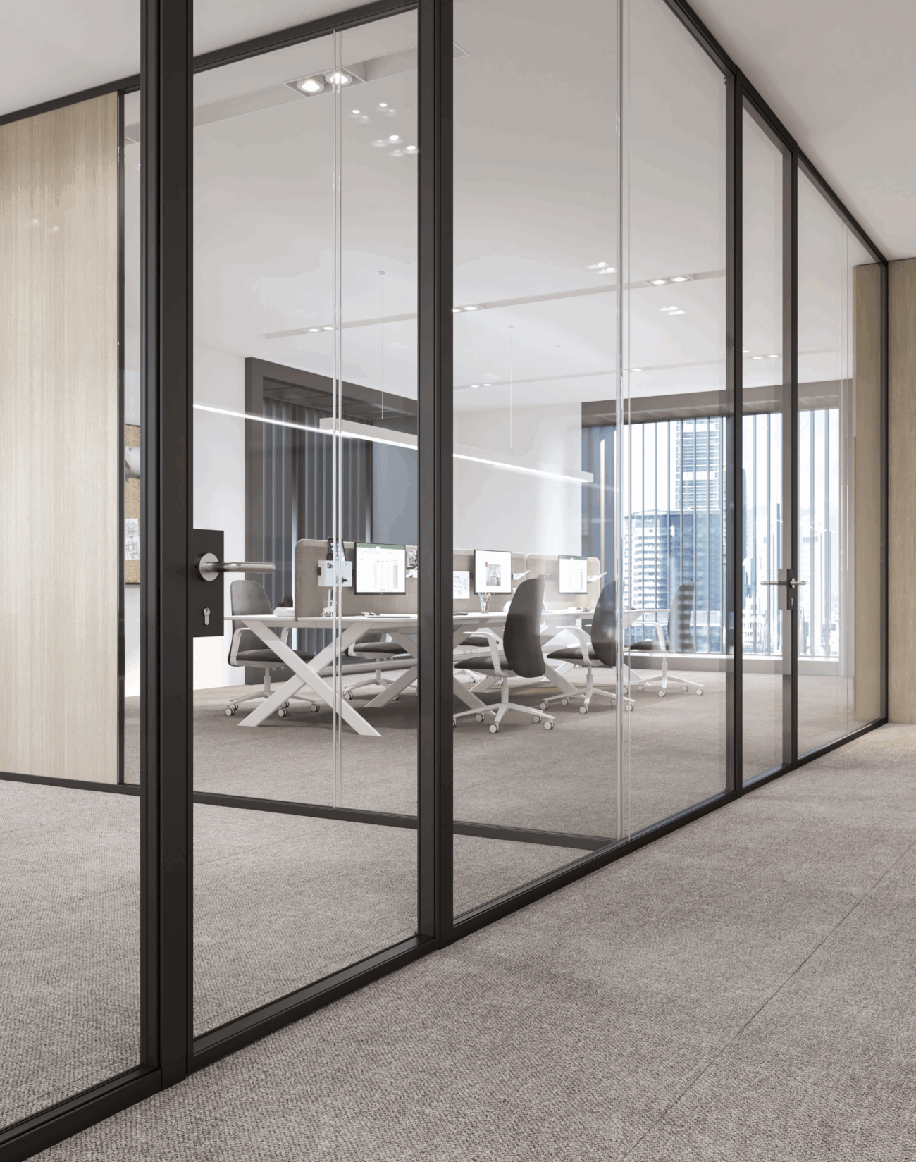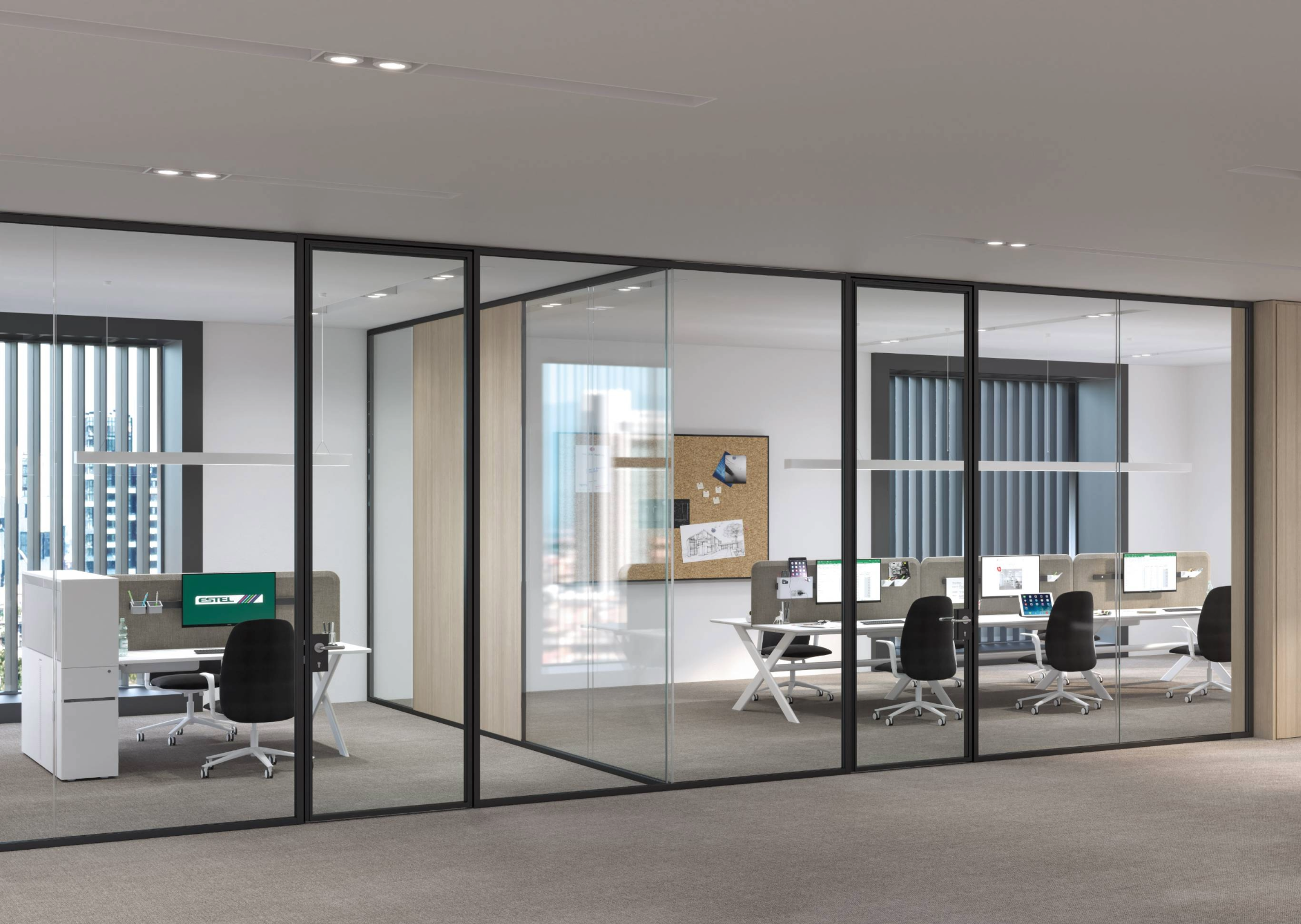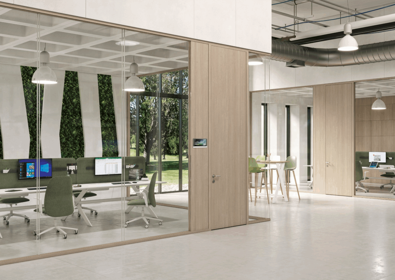 Con tratte vetrate e cieche, porte battenti ciece tamburate, nodo a T vetrato, passaggio cieco vetro e modulo tecnico.