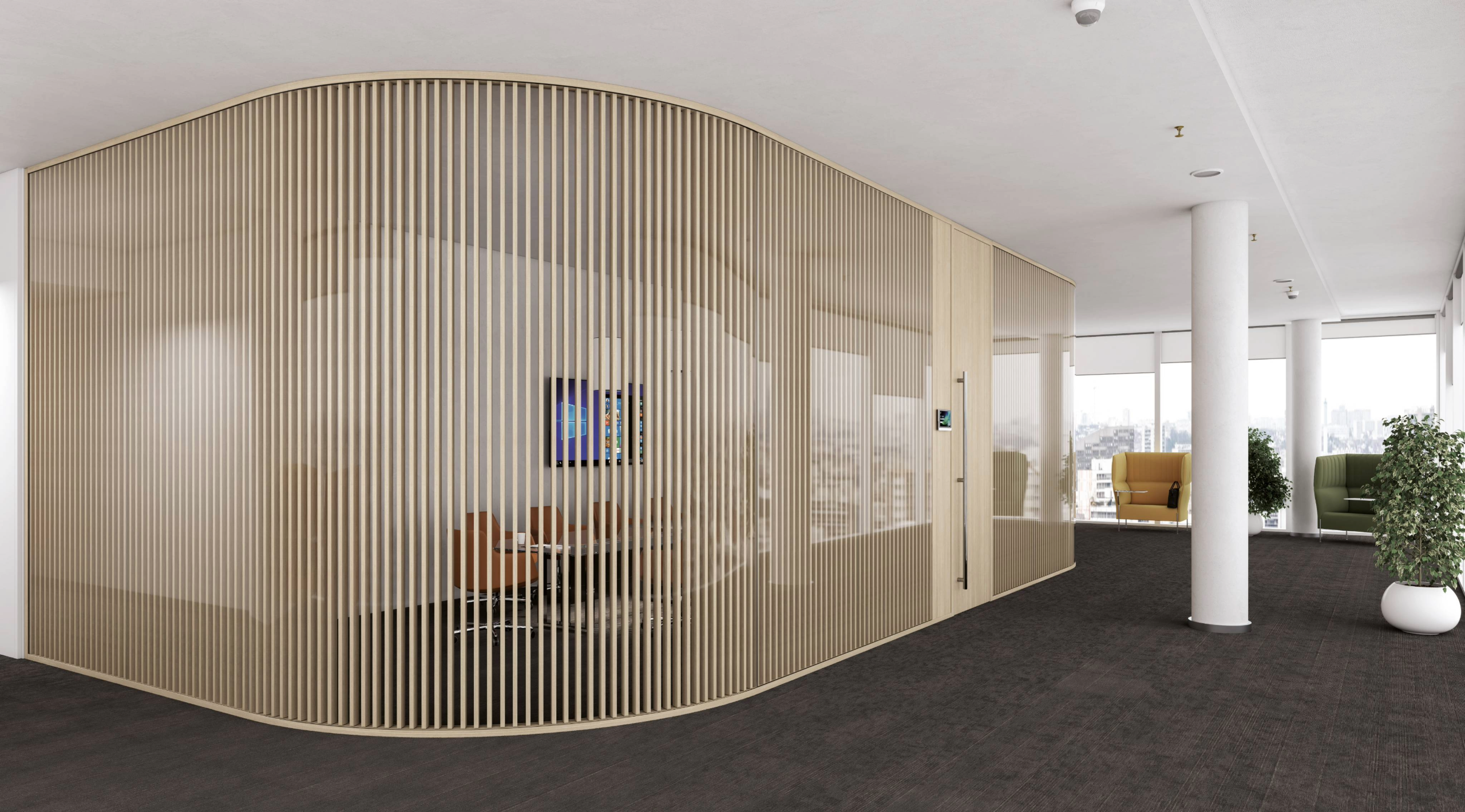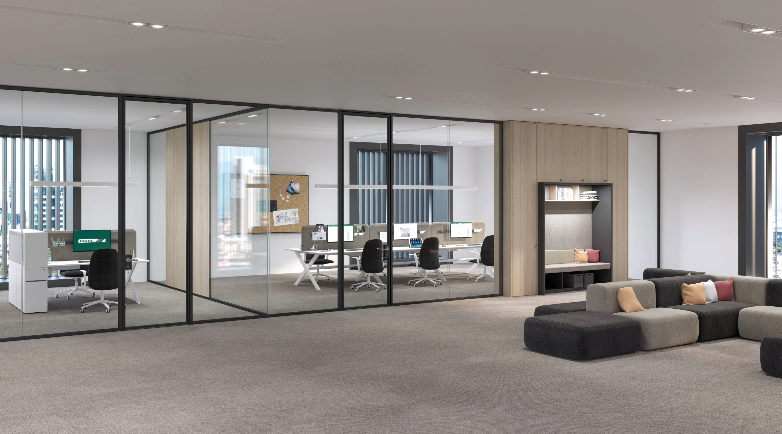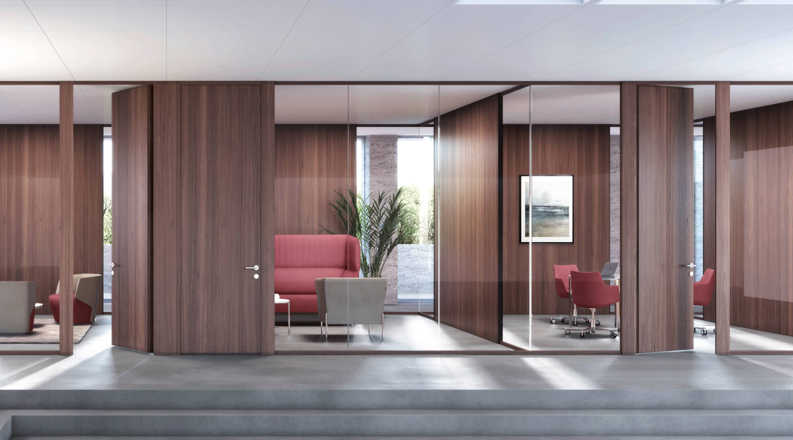 Con tratte vetrate e cieche, porte battenti ciece tamburate, nodo a T vetrato, passaggio cieco vetro e modulo tecnico.