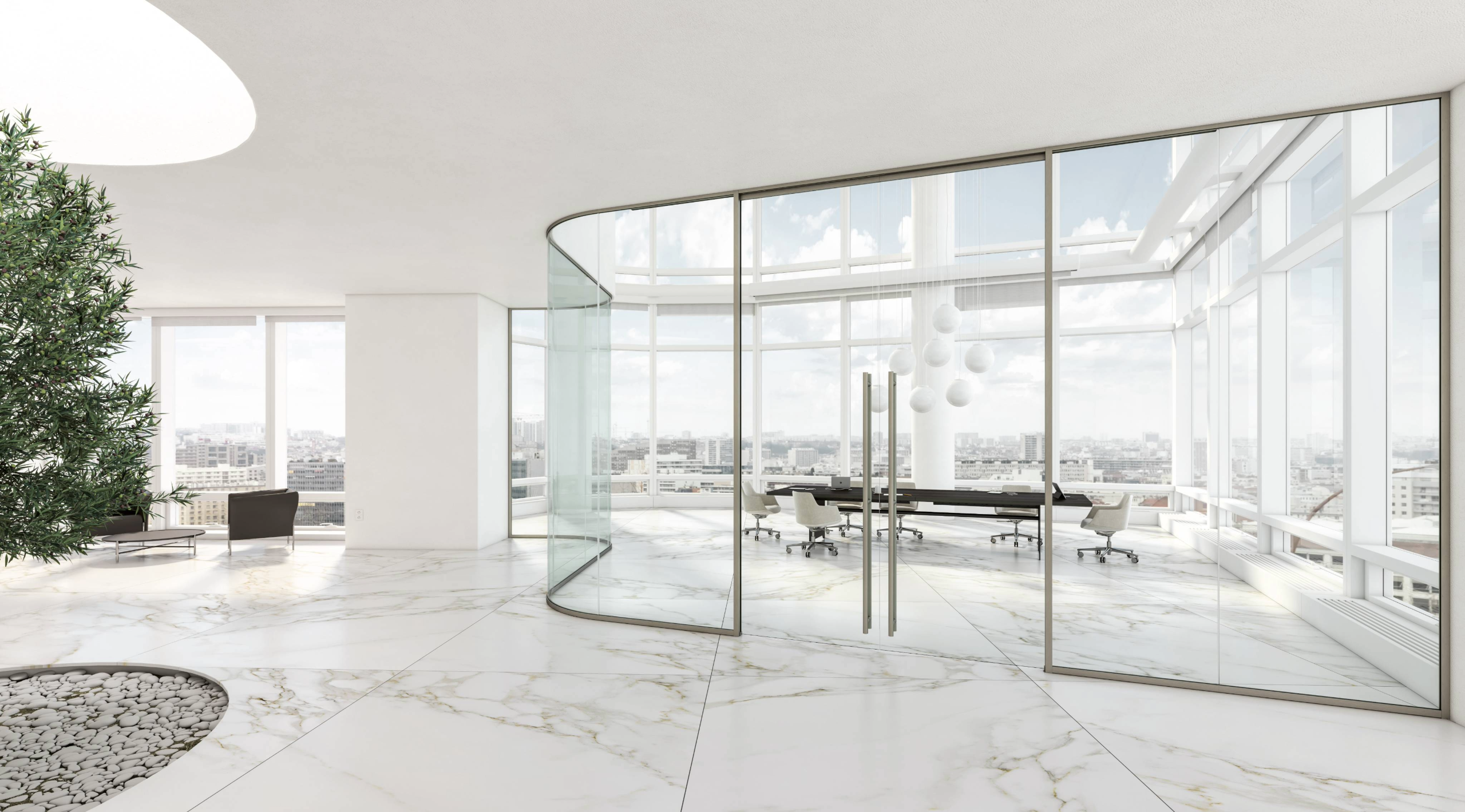 Parete vetrata, con profili curvi a misura. Porta scorrevole doppia anta vetrata non intelaiata con maniglioni.