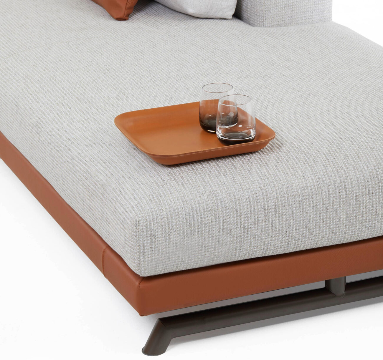 Schienale e cuscini, imbottiti in poliuretano espanso ignifugo, poggiano su fasce elastiche e sono rivestibili in tessuto, pelle o eco-pelle.