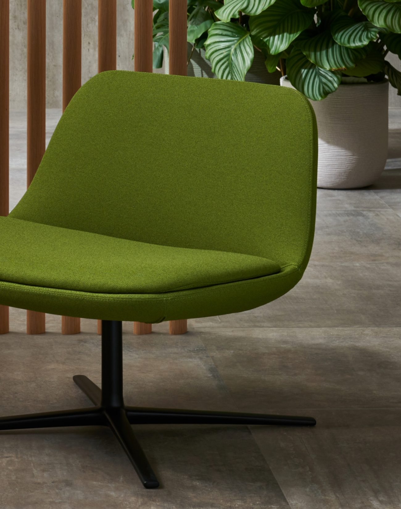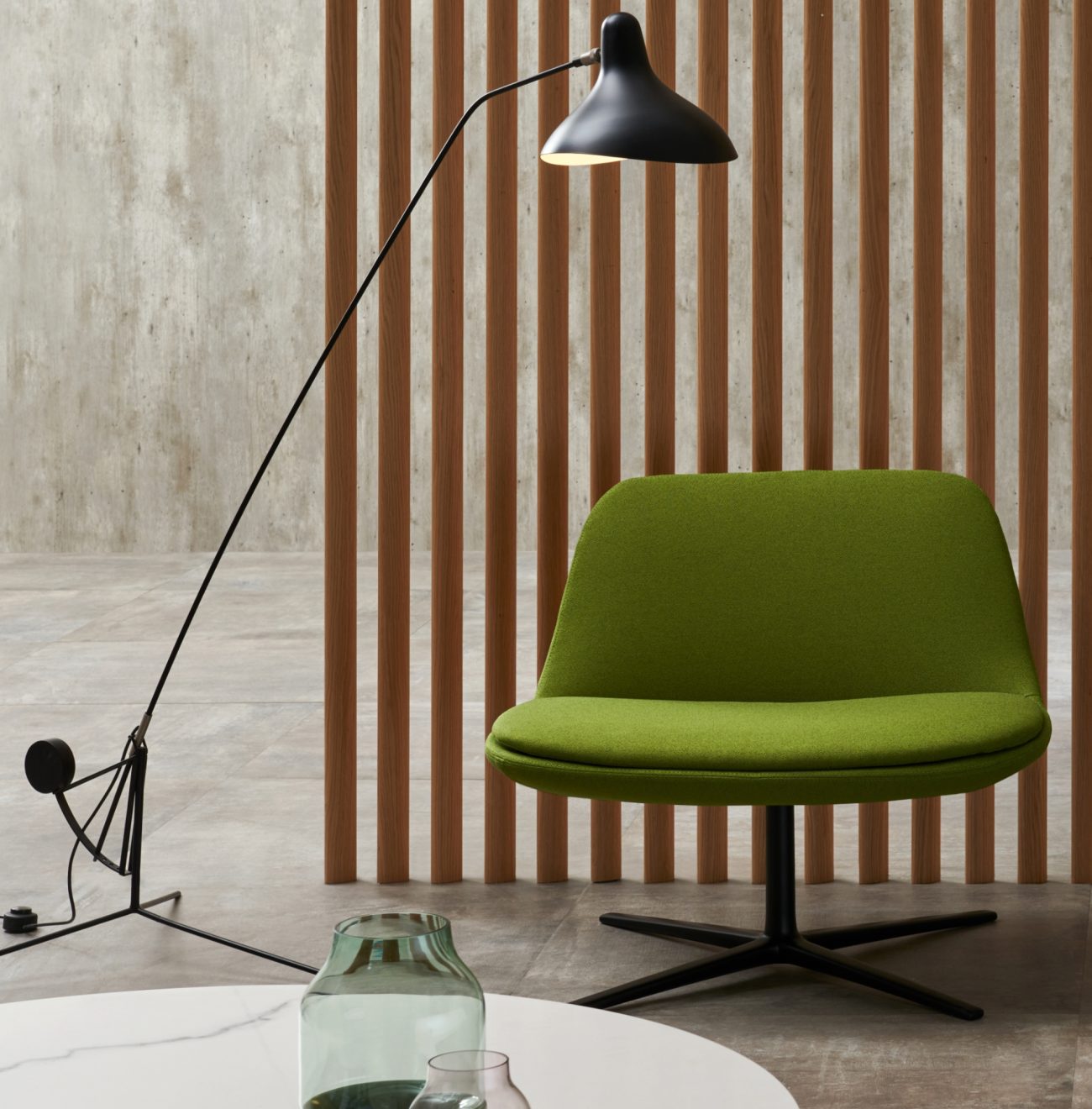 L’aspetto delicato e sinuoso si integra alla perfezione con il rigore della base girevole in metallo verniciato carbon glacé opaco.