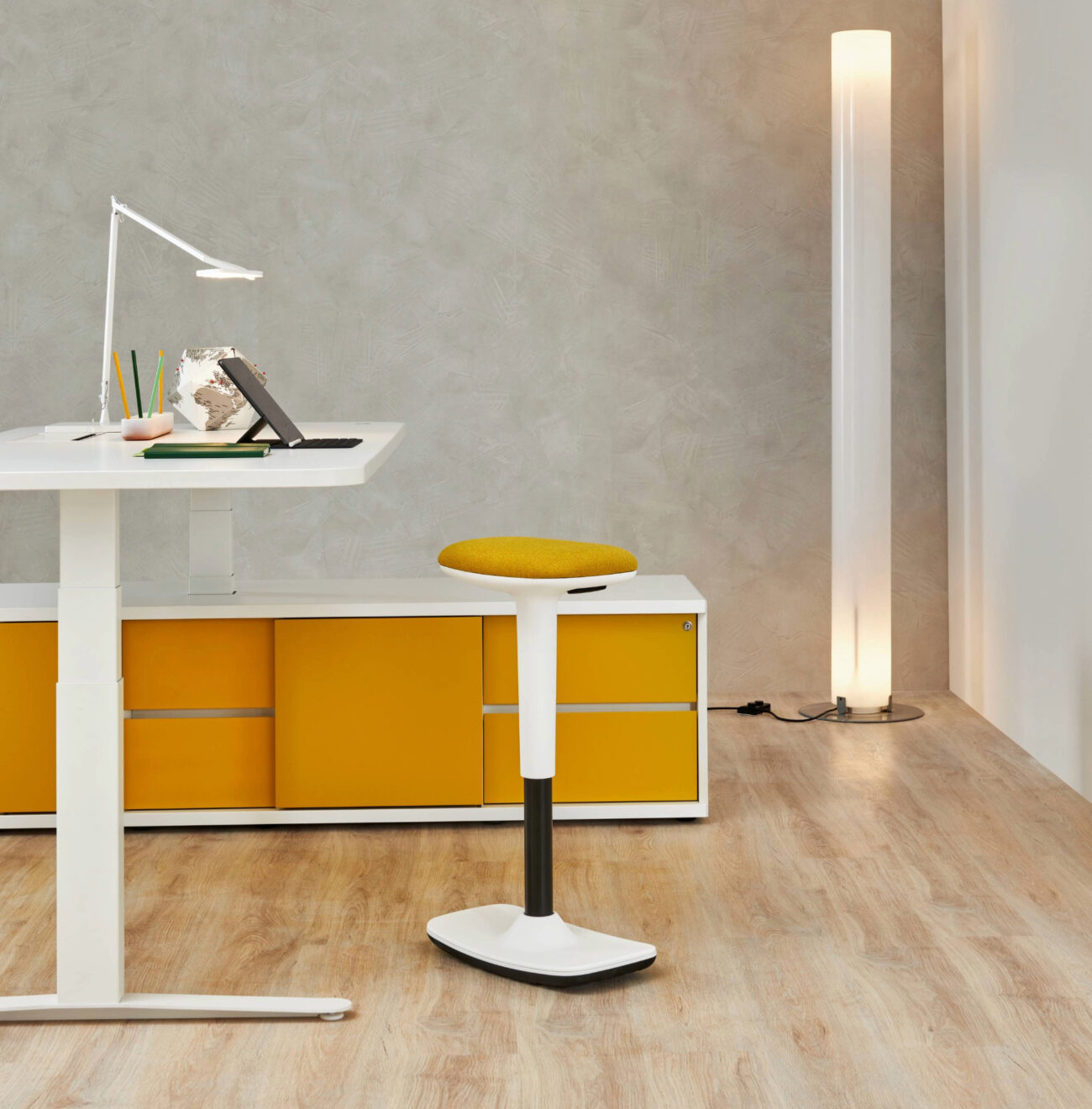 Up è uno sgabello che oscilla lievemente e lascia il corpo libero di appoggiarsi e adattarsi in movimento, pur restando in piedi.