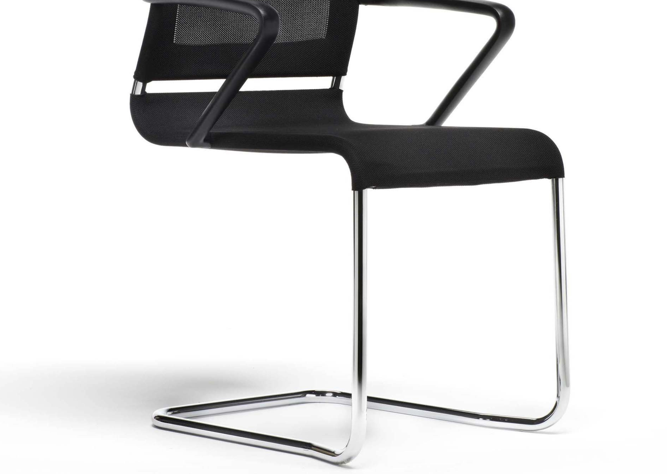 Verso è disponibile anche in versione trapuntata a sacco unico. La base è a slitta in acciaio cromato o verniciato nero, impilabile in entrambe le varianti (con o senza braccioli). Il bracciolo è in poliuretano integrale con anima di metallo