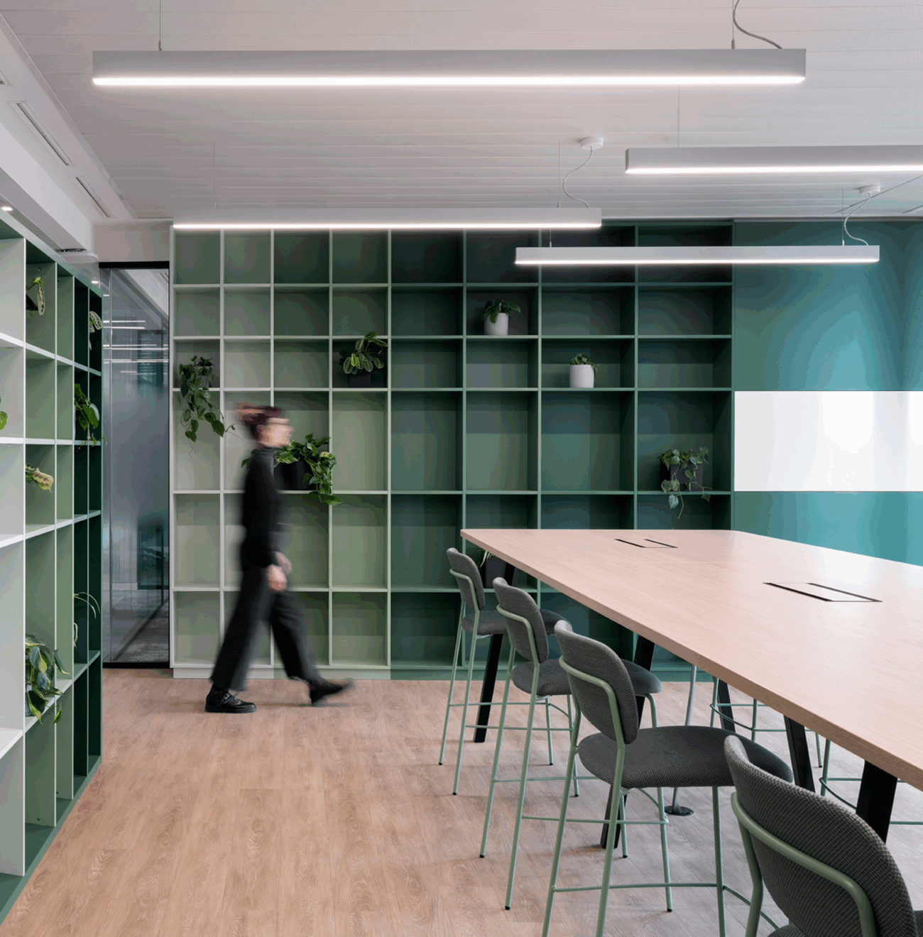 Tra gli elementi più distintivi del progetto, spiccano i tavoli organici: superfici condivise dalle forme rotonde o esagonali che spezzano il ritmo regolare dei bench a sei posti, introducendo varietà e fluidità visiva. Pensati per ospitare fino a otto persone, favoriscono sia il lavoro collaborativo che quello individuale, offrendo massima flessibilità d’uso. Al centro accolgono elementi vegetali, integrando i principi della biofilia e contribuendo a creare un ambiente più rilassante e naturale.