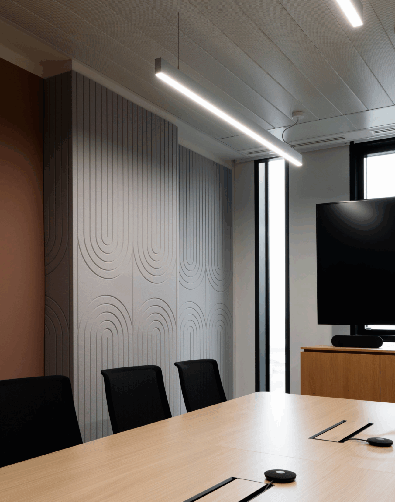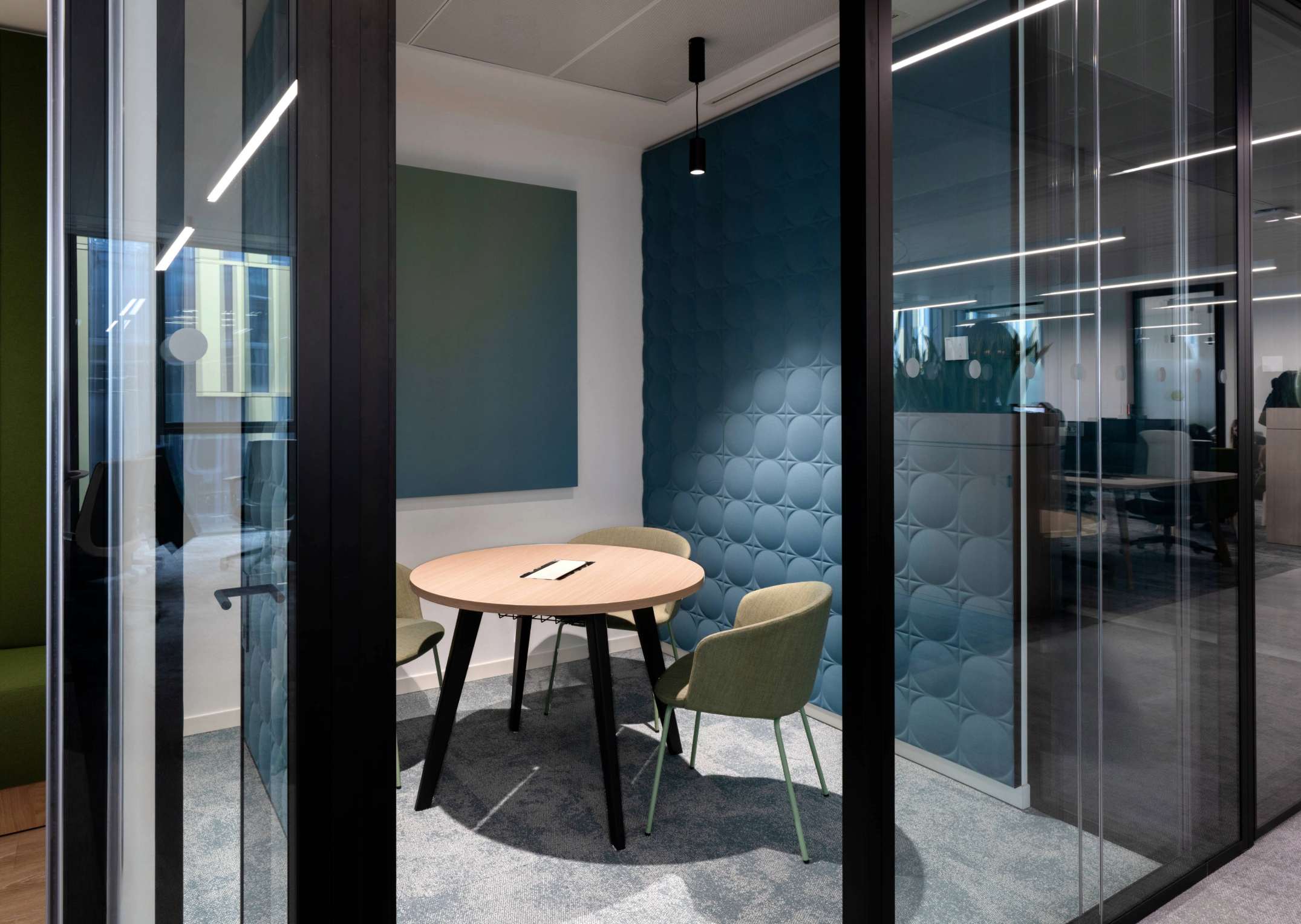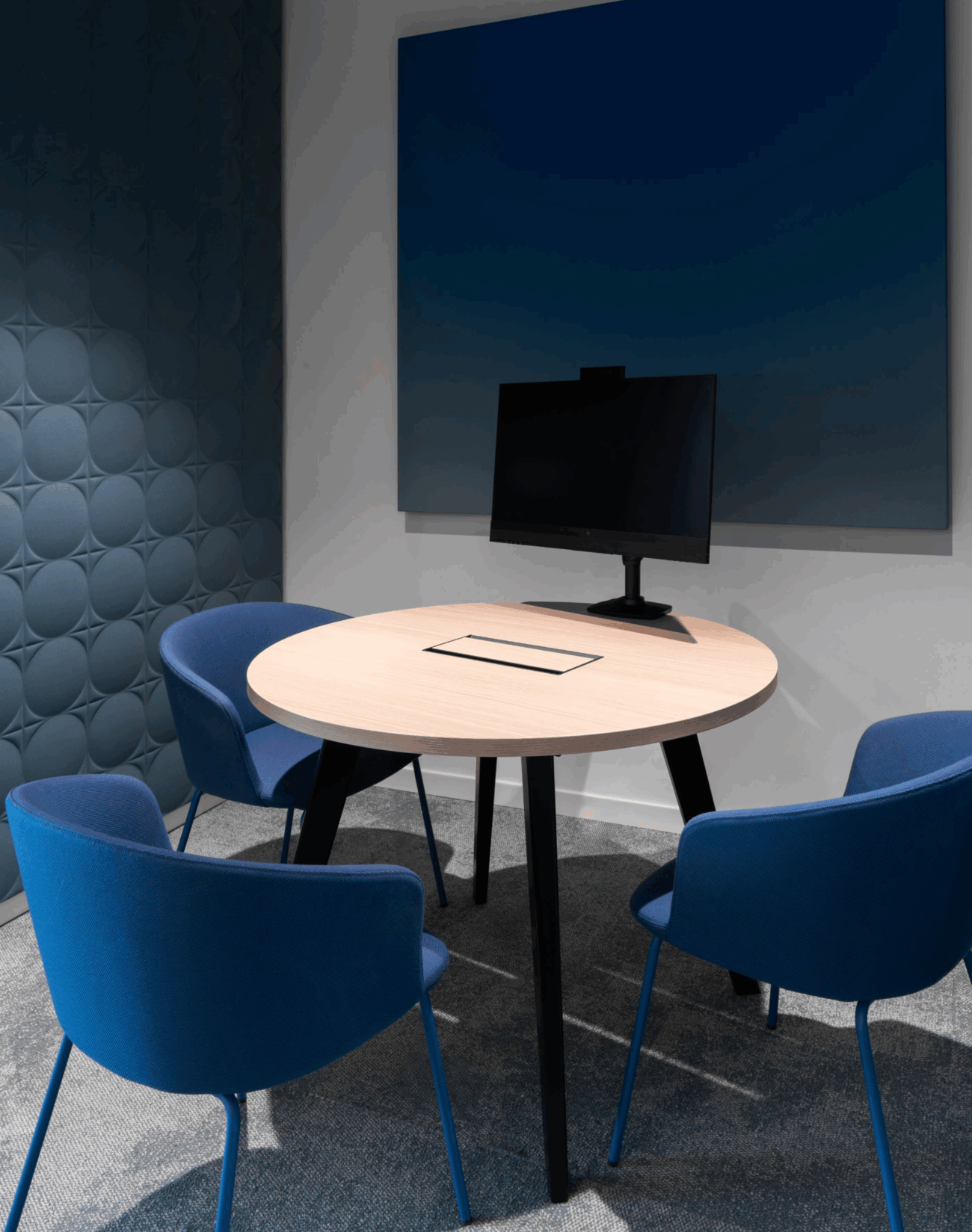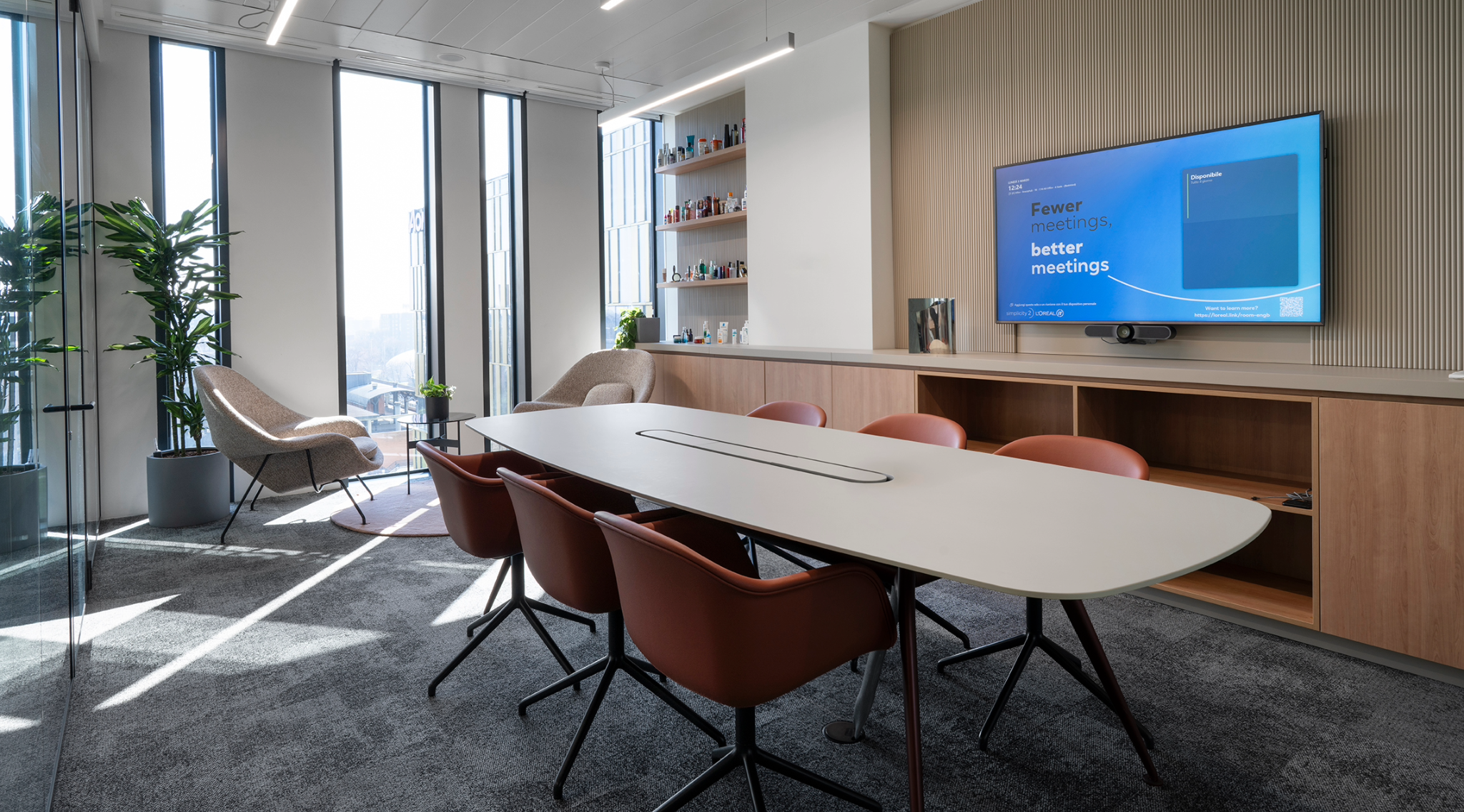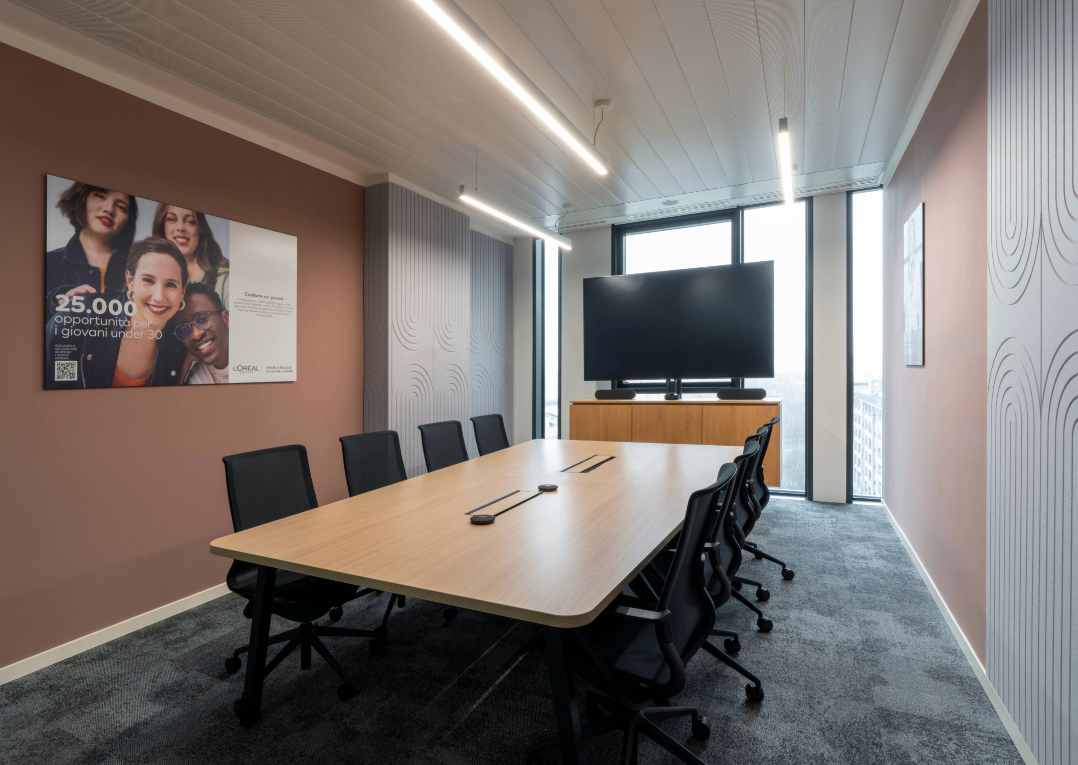 Le sale riunioni sono arredate con tavoli P045 dalle geometrie diverse che introducono varietà e dinamismo, garantendo al contempo connettività grazie a un’attenta gestione del cablaggio.