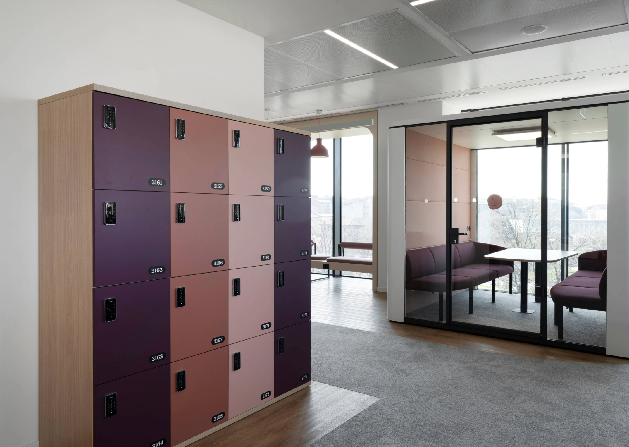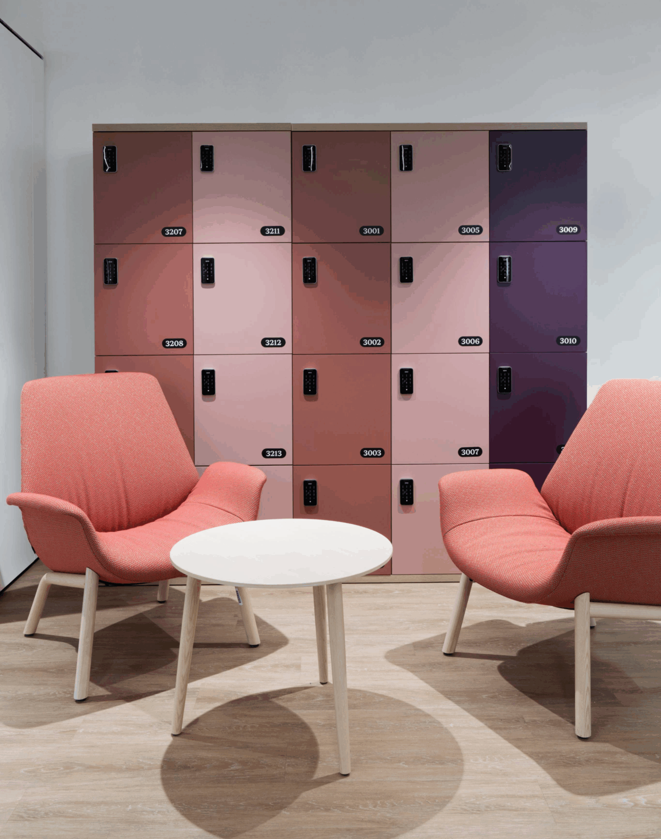 Il layout favorisce la fluidità degli spazi e la relazione tra le persone, grazie all’uso di materiali caldi, colori morbidi e arredi che si adattano alla morfologia di ogni area. Una palette cromatica nei toni del rosa, verde e blu definisce l’identità degli ambienti, declinata con coerenza nei pannelli fonoassorbenti e in oltre 1000 lockers personalizzati, realizzati con laccatura super matt per garantire fedeltà alla visione cromatica della direzione artistica. La finitura super matt, realizzata internamente da Estel, assicura una texture vellutata e anti-impronta. I lockers sono dotati di tecnologia avanzata per l’apertura con badge e sistemi di prenotazione, integrando estetica e innovazione.
