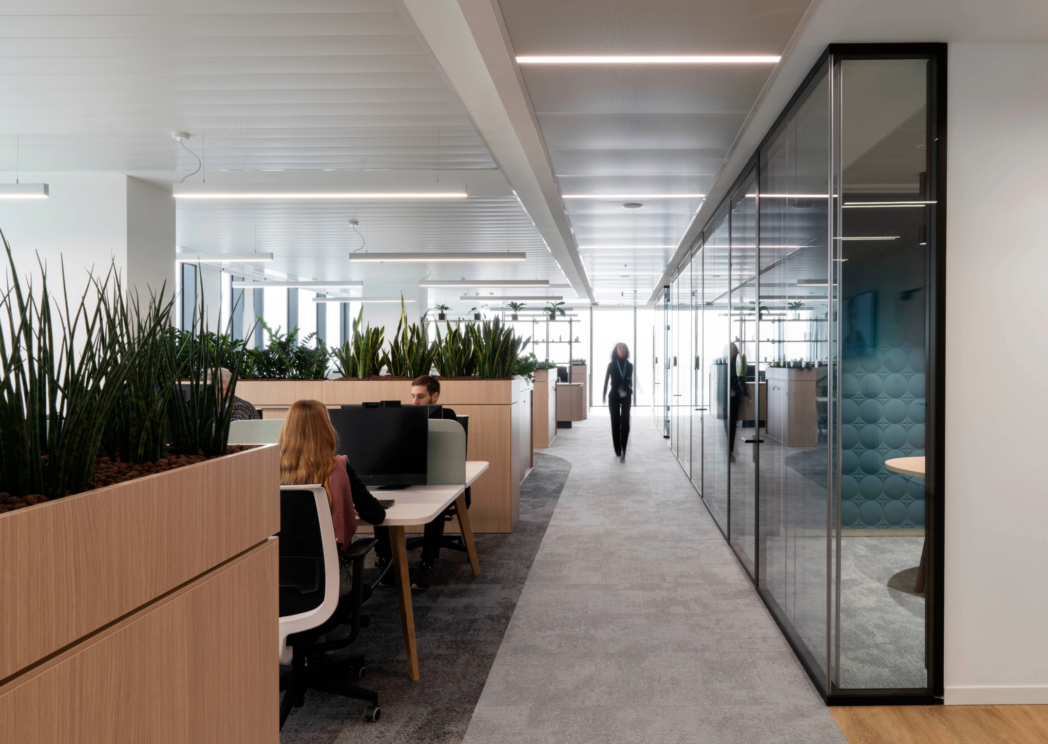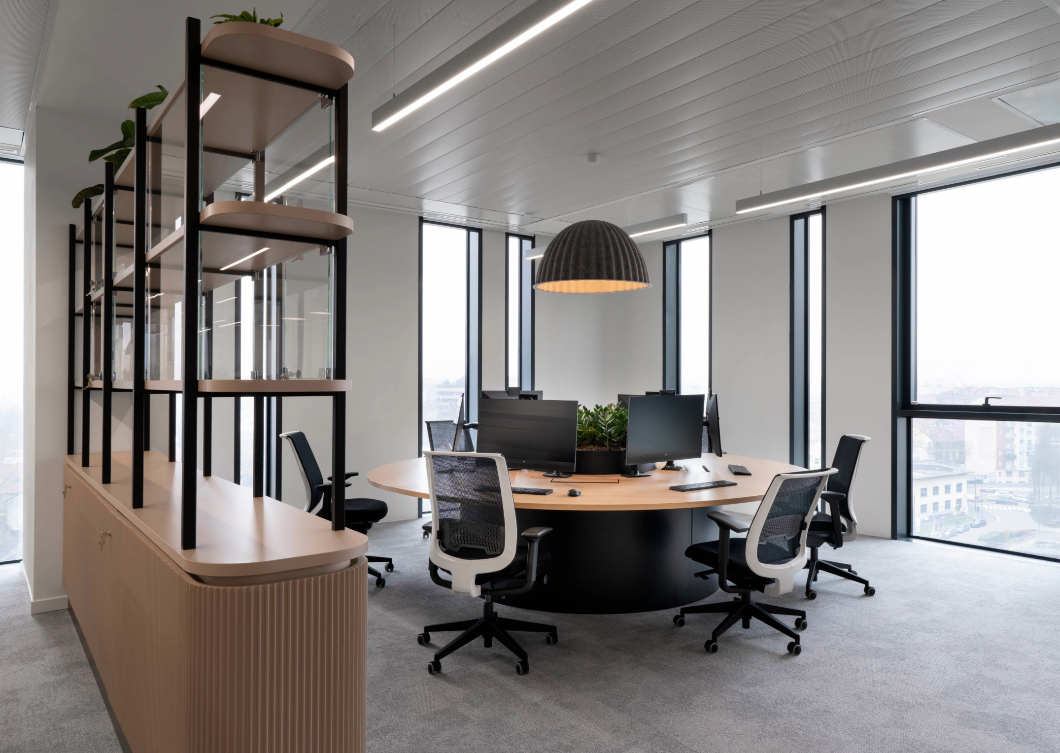 Tra gli elementi più distintivi del progetto, spiccano i tavoli organici: superfici condivise dalle forme rotonde o esagonali che spezzano il ritmo regolare dei bench a sei posti, introducendo varietà e fluidità visiva. Pensati per ospitare fino a otto persone, favoriscono sia il lavoro collaborativo che quello individuale, offrendo massima flessibilità d’uso. Al centro accolgono elementi vegetali, integrando i principi della biofilia e contribuendo a creare un ambiente più rilassante e naturale.
