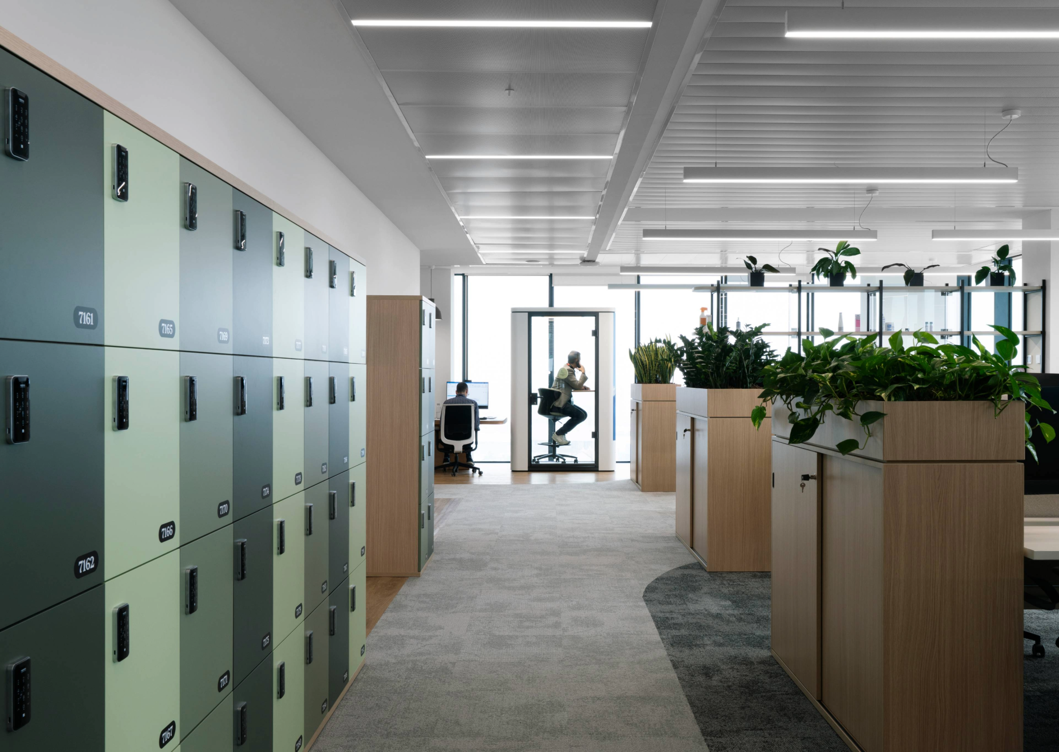 Il layout favorisce la fluidità degli spazi e la relazione tra le persone, grazie all’uso di materiali caldi, colori morbidi e arredi che si adattano alla morfologia di ogni area. Una palette cromatica nei toni del rosa, verde e blu definisce l’identità degli ambienti, declinata con coerenza nei pannelli fonoassorbenti e in oltre 1000 lockers personalizzati, realizzati con laccatura super matt per garantire fedeltà alla visione cromatica della direzione artistica. La finitura super matt, realizzata internamente da Estel, assicura una texture vellutata e anti-impronta. I lockers sono dotati di tecnologia avanzata per l’apertura con badge e sistemi di prenotazione, integrando estetica e innovazione.