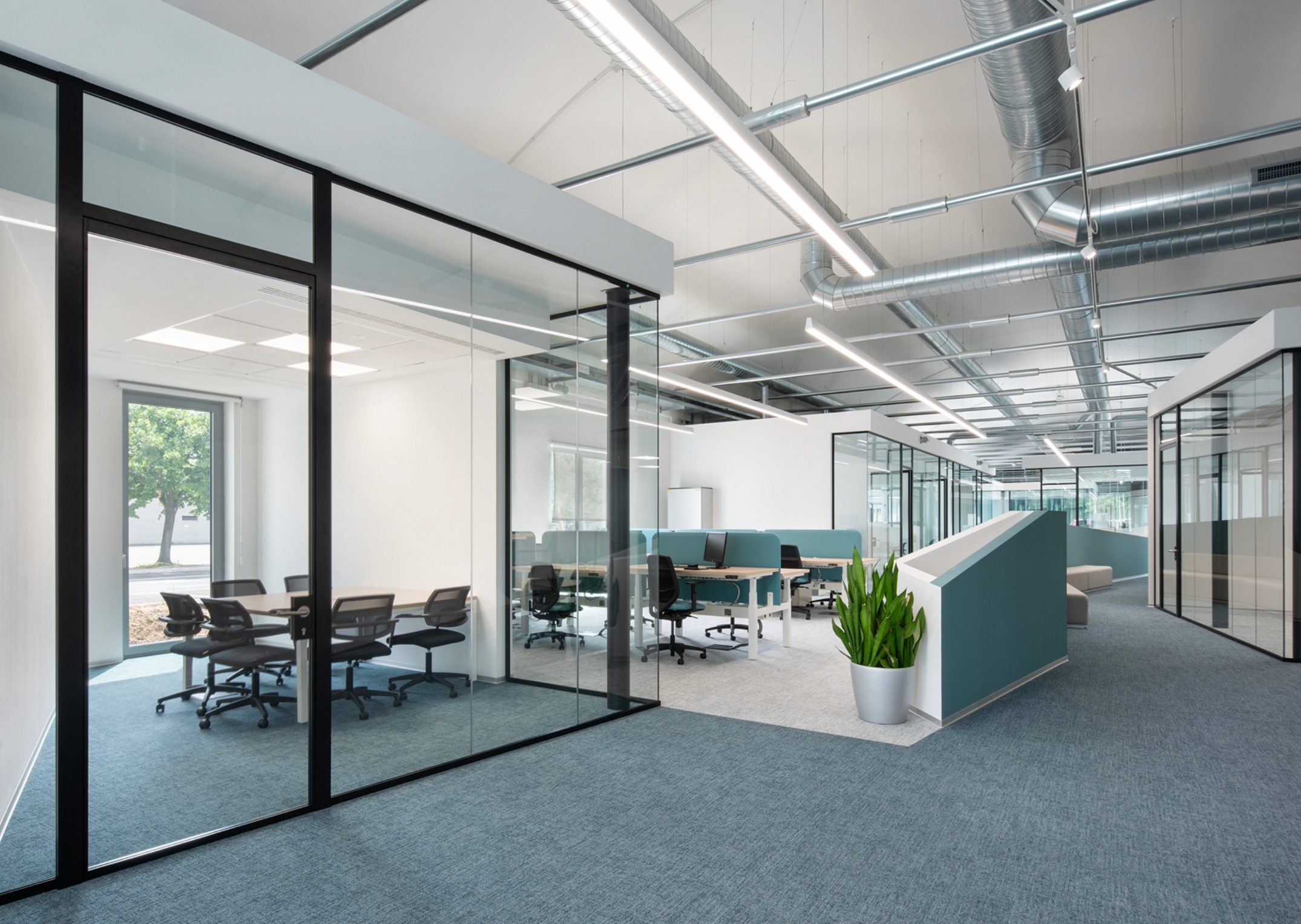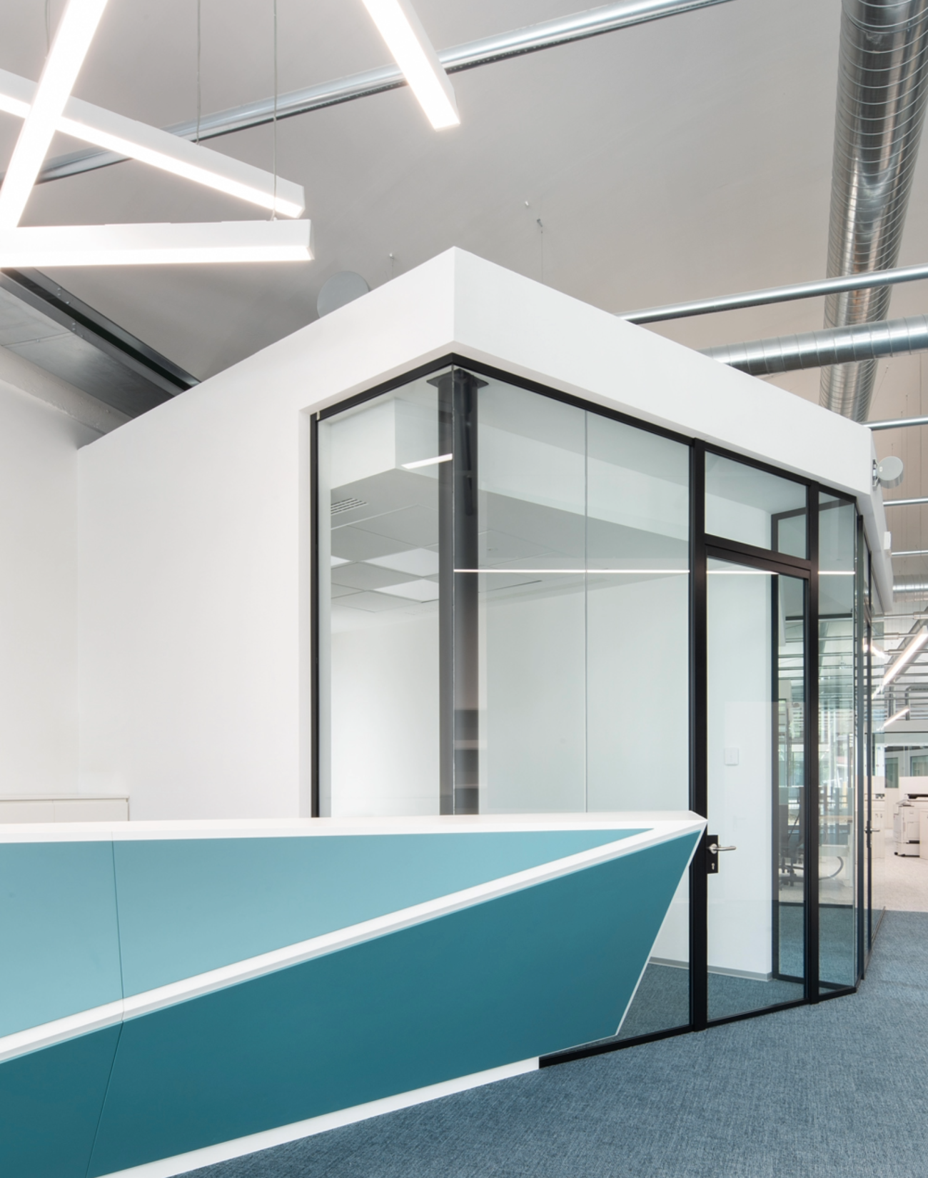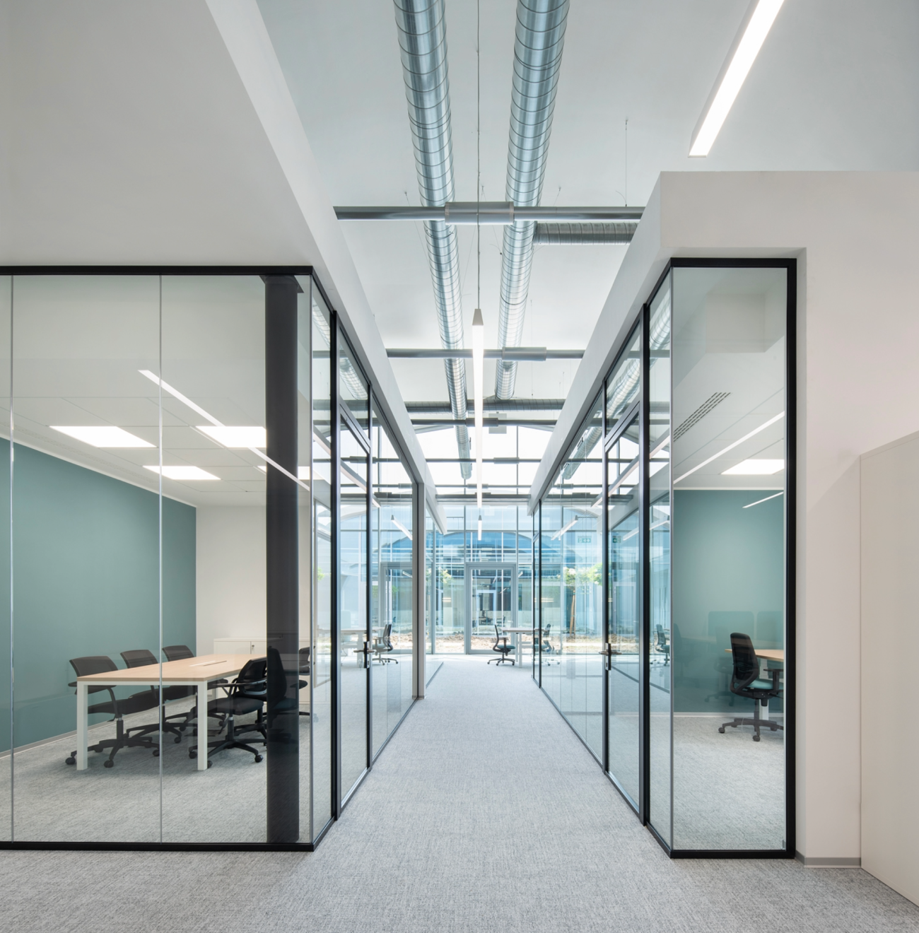Le pareti divisorie, realizzate su misura con altezze fino a 4 metri, si inseriscono armoniosamente nei grandi volumi dell’edificio. La trasparenza garantisce una continuità visiva tra gli ambienti e valorizza la luce naturale.