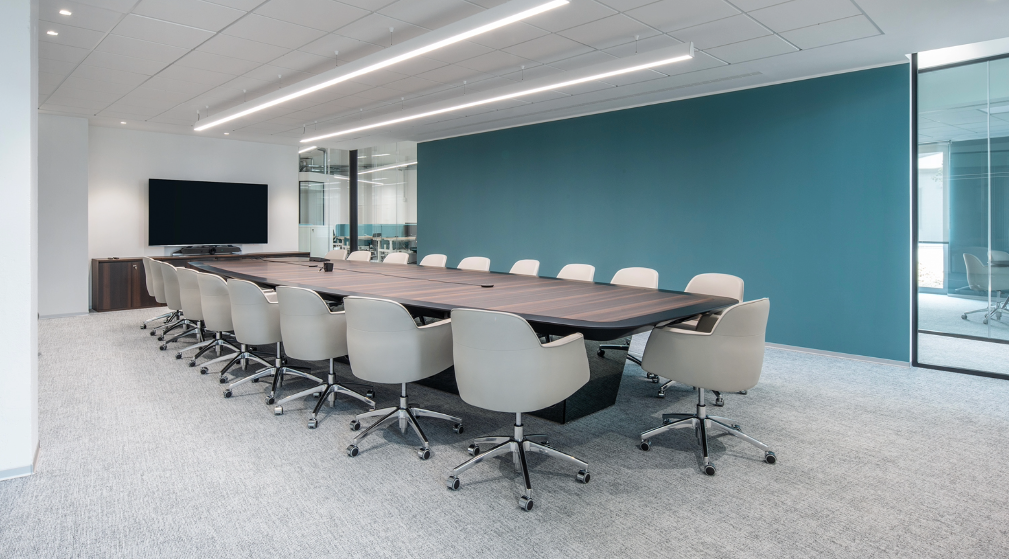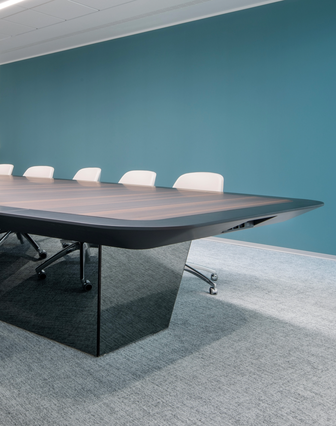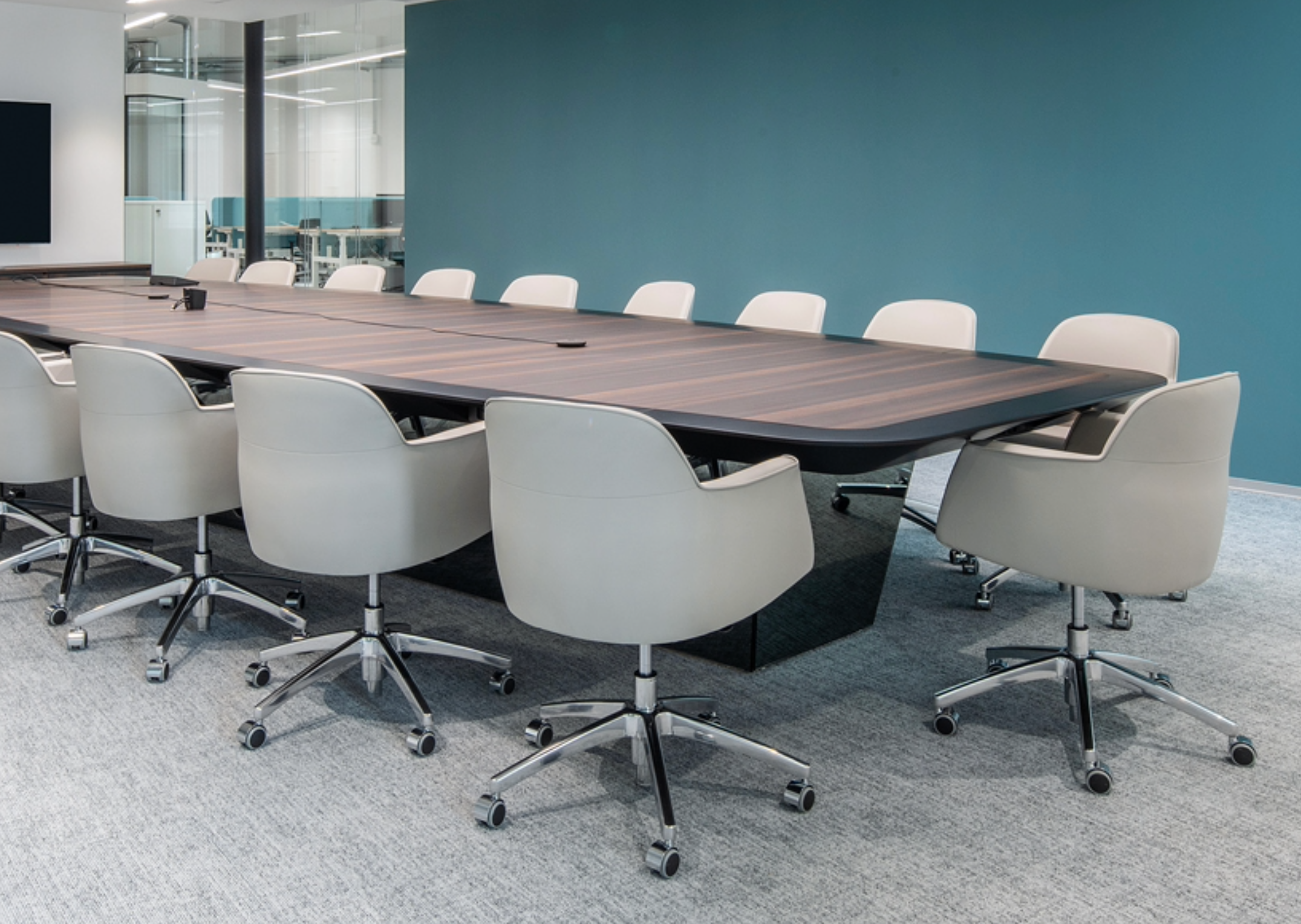 La sala riunioni è dominata da un tavolo custom, con finiture di pregio e tecnologia integrata nella struttura. Un ambiente pensato per offrire un’esperienza di lavoro contemporanea e raffinata.