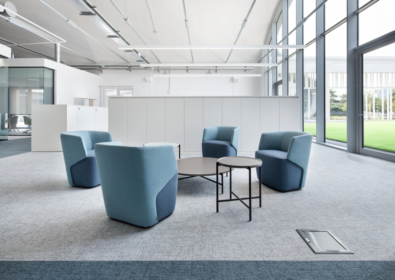 Distribuiti in punti strategici dell’edificio, le aree lounge offrono un’atmosfera rilassante grazie alle stesse cromie utilizzate nel resto del progetto. Un invito al benessere anche nei momenti di pausa.